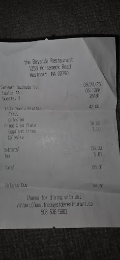 We have gone to the Bayside many times and always had the best food. Last night was not good. The so called "best" lobster roll around was all lobster legs and one claw in a small hot dog roll. We chose eggplant fries as we always do they were burnt and when you bit into them there was no vegetable because they were so over cooked. My husbands apple pie was good as usual my blueberry pie way too tart not enough sugar. Our waitress was rude and very "business" like and did not address the burn't eggplant fries except asking if we would like to take an order home as she was walking away from the table. The eggplant fries are a $1.75 up charge which we are always willing to pay because in the past they have been delicious. She could clearly see they were inedible but did not remove them from the bill. I noticed other patrons fried seafood to be very dark and over cooked perhaps needed to change the oil on a Saturday afternoon. I feel bad we have always loved going to your restaurant but hate to pay good money for sub par food and rude staff. Maybe just an off day for your business but I had to pay for it. I am a 20-25% tipper but left $10 for a $90 bill I can't see not tipping because your staff is working but no way was our server even...
