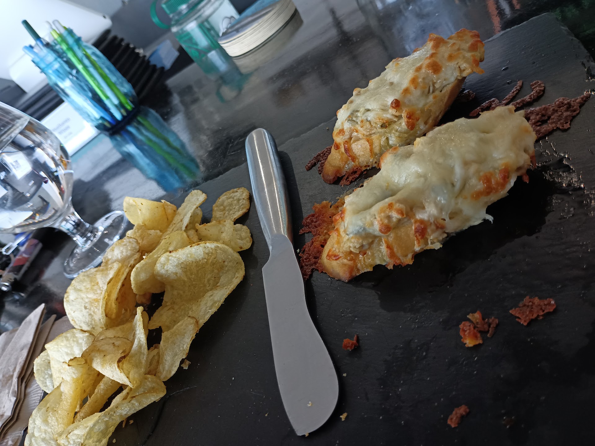 Vinho Verde along with their tuna melt was a surprisingly good pairing. The melt comes on the open face sandwiches. Local tuna is seasoned and tops a slice of French bread which is then covered with mozzarella. It spends time under the broiler to bubbly, caramelized goodness. Add kettle chips on the side.