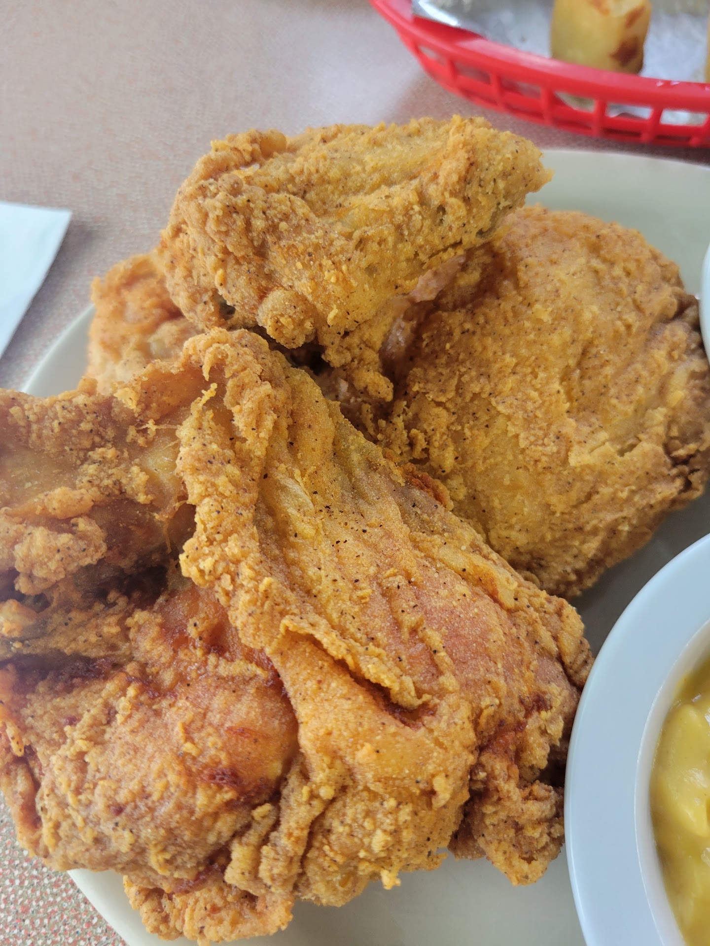 The owner (great guy!) gave us menus and took our drink order. We split a 4 pc chicken dinner with mashed potatoes & gravy along with mac and cheese. After a short wait, around 5 mins, he returned with our meal, and he already had it on two plates for us. There are no frills here. Exactly what you order is what comes on the plate. No garnish, no flourish. But man oh man, is that chicken gooooood. The skin is crispy but not fried hard so that you think your teeth will shatter. The seasoning is just right - super tasty! The meat is moist but not underdone. This is the kind of chicken you remember from grandma's house on Sunday. Or in this case, Pa's house.