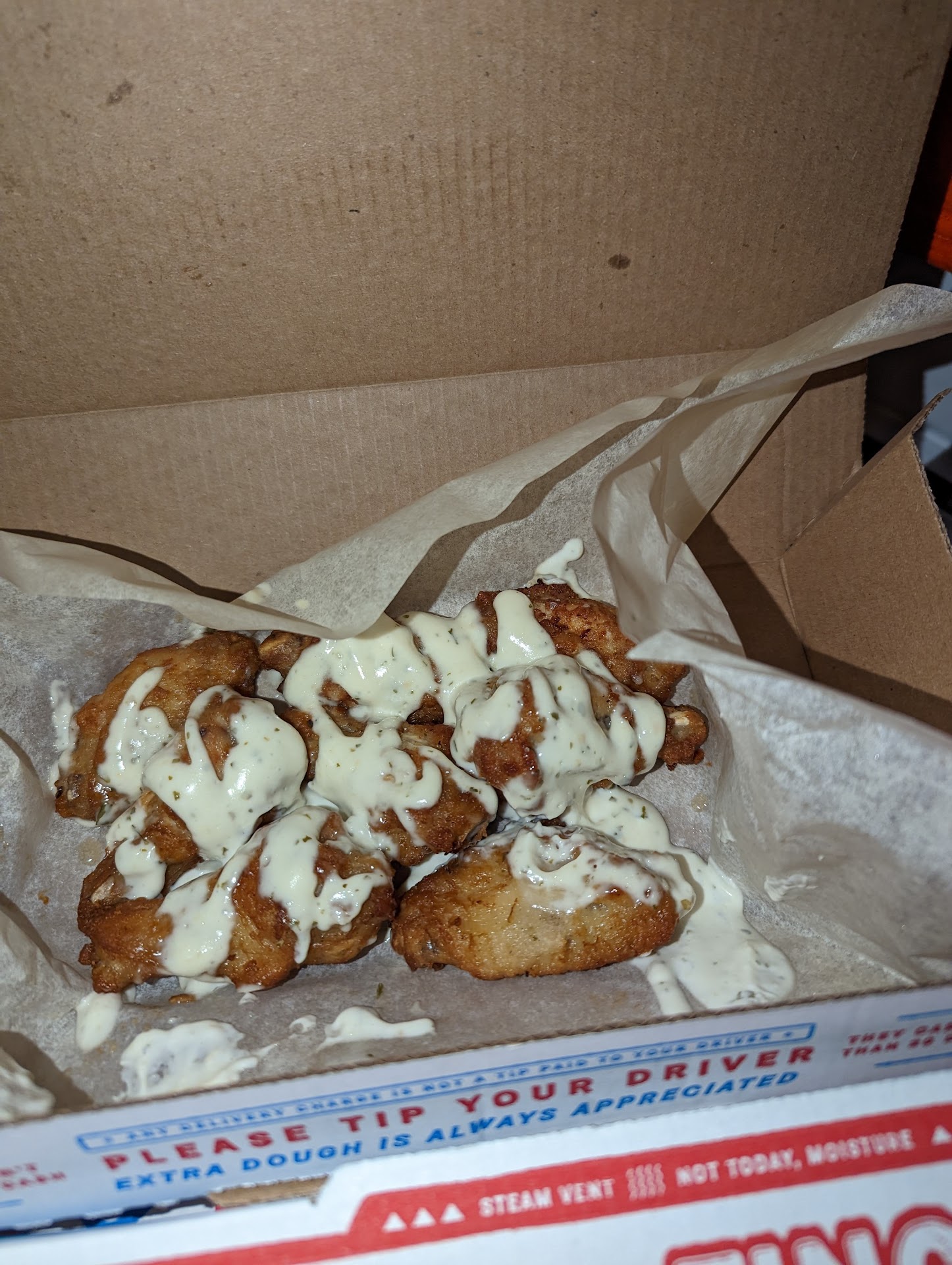 Looks like ranch wings to me...YES?! NOT SUPPOSED TO BE! When we called the store and confronted the store the rude lady on the phone said that's how they are supposed to be. then hung up on us. IDK about y'all but I travel a lot and sometimes dominos is the easiest and best option. I typically have great or good experiences at dominos . as you can see with my 4 to 5 star reviews for other dominos in AMERICA!. Here is my problem we ordered garlic parmesan wings and that is one of only 2 or 3 flavors that we ever order. I have never gotten ranch all over my wings and told that's how we do it.