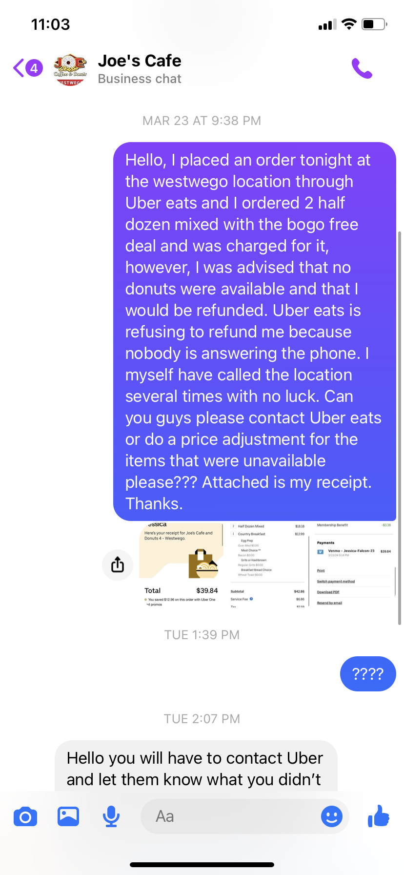 I ordered joes cafe in westwego through Uber eats Saturday night and they had a buy one get one deal for the half dozen mixed donuts so I ordered some. When the driver got to joe’s, he called me and advised that they did not have the donuts I ordered I asked if there was even just glazed donuts and he said no. I told him to tell the store to just mark it unavailable so that I’d get a refund. I WAS TOLD I WOULD GET A REFUND! When my order arrived, nothing was adjusted (which the stores can do on their end because they sure as hell would have adjusted it to charge me extra if I asked for something to be added, so they’re 100% able to mark something unavailable and do a price adjustment) but ANYWAY I noticed it wasn’t done so I contacted Uber eats they wanted to confirm with Joe’s that what I was saying was true so they asked me to hold and called joes. Nobody answered. This agent called several times and I even tried multiple times because I was furious at this point. He was unable to refund me because of Uber eats policy AND JOES SIMPLY IGNORING THE PHONE RINGING OFF THE HOOK!!! I decided to wait until the next morning. I called in and the kitchen manager spoke with me and advised she would pass it on to the other manager and they would follow up with me. I have yet to receive a phone call. So I tried messaging the Facebook page. (Messages exchanged below) Y’all are playing games bro. This is legit the worst customer service I have ever experienced I just want my damn $9 back for what I did not receive!!! My family has frequented joes for years and never had issues until now. It’s absolutely ridiculous that I’m having to go to this extent for someone to simply do the right thing!!!! I’m truly disappointed af bc I love y’all’s donuts and food but this is bad management at its finest and I will not be back to support this business...