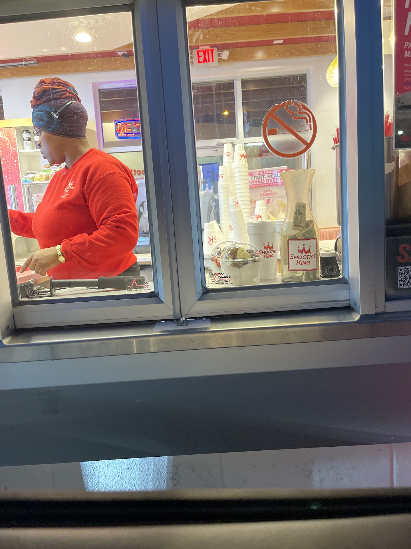 My experience was appsolutely horrible. I called before going to this location to speak with someone who seemed to want to run me off before hearing anything I had to say. I ordered twice by accident.. ended up paying for 6 smoothie's totaling $57 bucks... I called to try and cancel the double order... He spoke over me and said that I needed to go to the smoothie king application and contact customer service.... So I drove to this location and was greeted at the window by the same rude smart mouth boy... Asked me what was my order and I told him that I have 2 of the same orders just different order numbers.. he said... What was your order?.. I started to read the ORDER NUMBERS and was again shut down by being interrupted and spoken over .. until a 2nd guy walked up and handed him 6 smoothie's... I told the guy thank you and have a good day.. he responded ummm humm.... This place is a joke and being treated like this and still spending $57 bucks.. way to go smoothie king for NOT being smooth at all. The smoothie's...