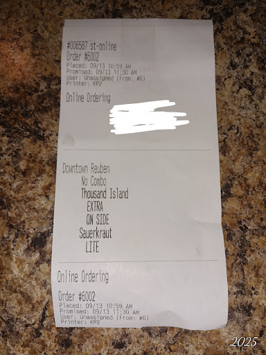Ā Ā Ā Read moreI do really love this place. I really love Rubens and this is the only place I will order one. So after craving one for the last 2 weeks I placed an online order and stop by on my way home to pick it up. I opened it up to eat it about 30 minutes after I got home and thought it was awfully weird that my Ruben did not have the rye bread that it usually does. I also noticed that it seemed awfully light on meat. I took a bite and realized that this was not a Reuben. After looking a little more closely, I realized it was a roast beef with cheese. A bland one at that. I do not recommend whatever that sandwich was, however I do recommend getting the Reuben. Check my ticket, it says Reuben on it and theyeven remembered to give me my extra thousand island dressing on the side that I asked for. And the paper that my sandwich was wrapped in even had an "r" on it, which I assumed was for Reuben. I called to let them know about the mistake and they did offer to replace it but with my game on, I definitely don't want to leave. So they offered to give me a refund to make it right, which I definitely appreciate. But I'm still left wanting the Reuben that I've been craving...