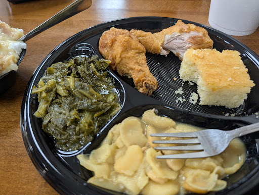 Read morePick up to go plates from call in order. Was a bit unsure what door to enter when i walked up on sidewalk. Maybe I just didn't see name on the door... 1 plate was country fried steak.& madh potatoes instant potatoes or so they tasted & looked.. nothing to brag on, was hoping it was going to be made there instead of frozen steak patties. Butter beans & black eye peas. Butter beans were yummy, no so much on the peas. However their cornbread was so fresh it would not stick together to pick up & eat. It was delicious. 2nd plate waz poppyseed chicken casserole on rice, butter beans & black eye peas w/ cucumber salad. Casserole was ok, peas the same & other things were really good. Maybe Monday was not the best day to try for 1st time. I'll give it another chance on a different day. I will say that their prices are very reasonable & fair. Where can u get a togo...