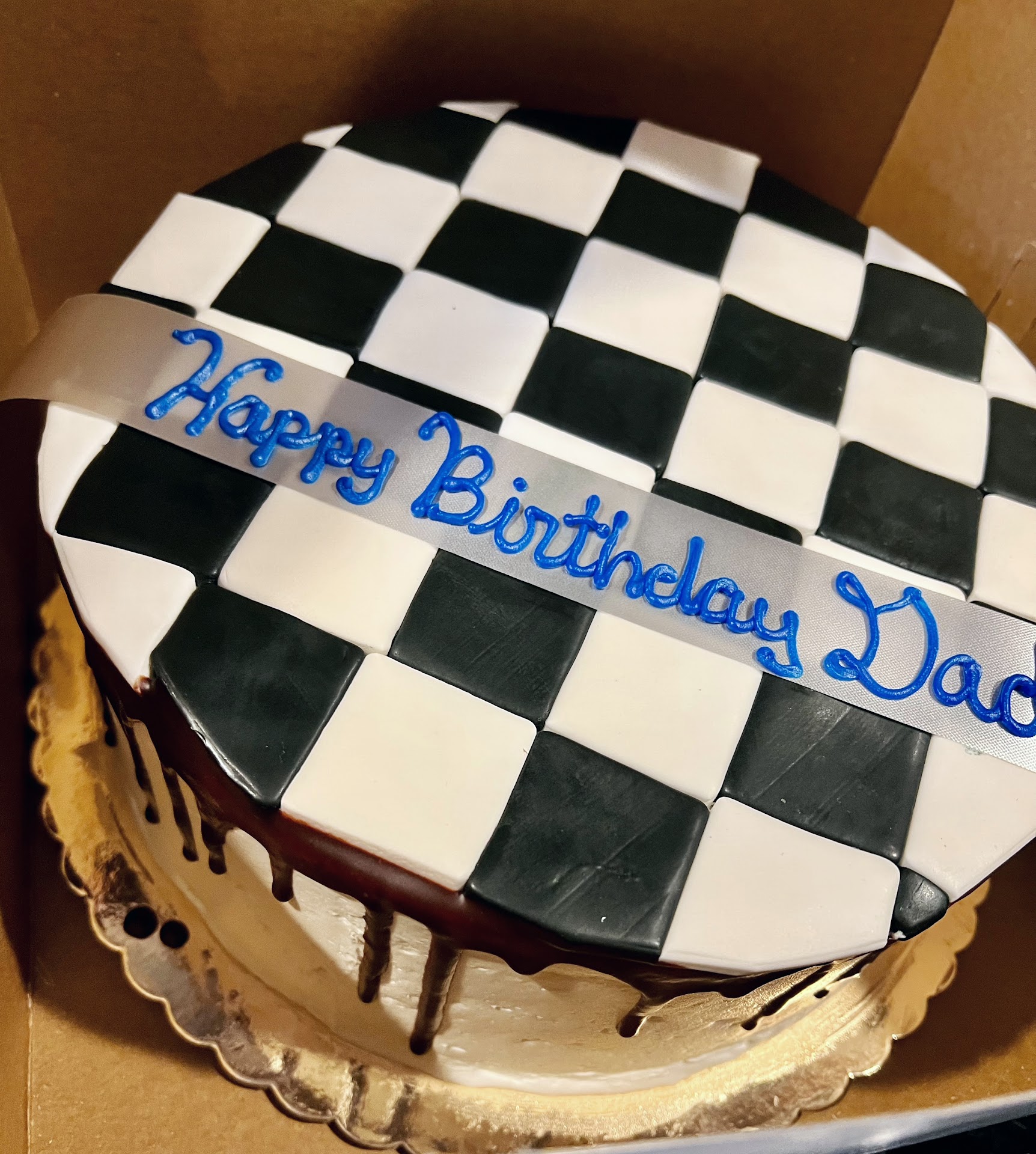 (I purchased the candles & chess piece cake toppers elsewhere) The cake was beautiful and my dad absolutely loved the perfect fondant chess board! The cake itself was a two layered 9-inch chocolate cake with ganache in-between the layers. Everyone LOVED it! It was so, so good.
