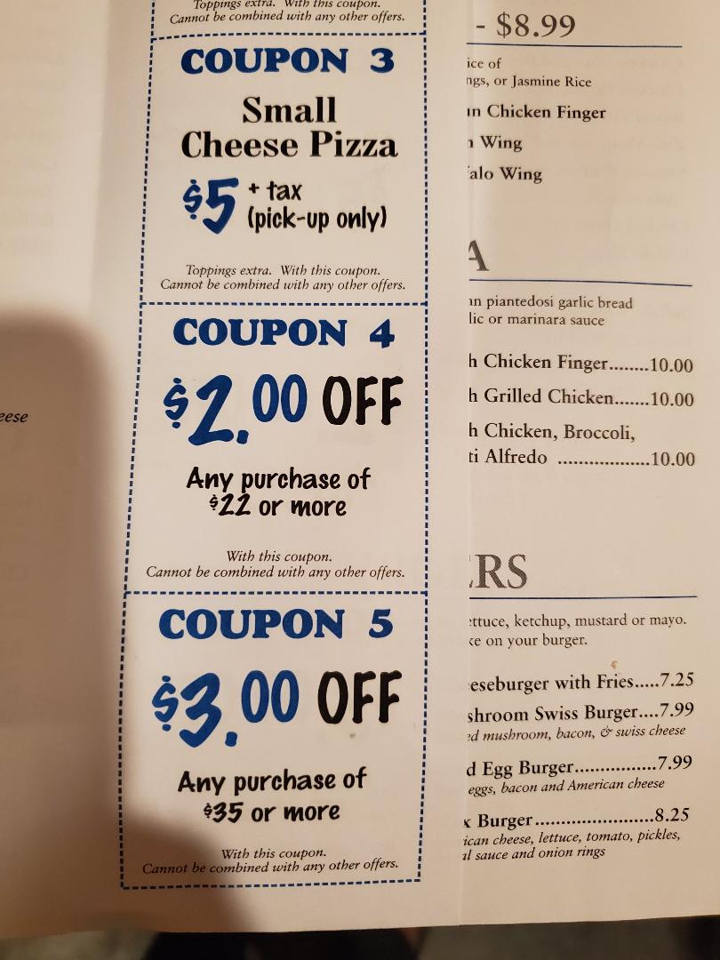 I called and ordered a large chicken cordon bleu calzone and an order of chicken broccoli and ziti. The girl who answered the phone, to her credit, was very pleasant. After completing my order, I informed the receptionist that I had a coupon that took two dollars off of an order which exceeded $22.00. I was transferred to a man, I presume the manager, who informed me that this is an old coupon that is no longer accepted. Despite the fact there is no expiration date posted, I told him that it was not a big deal.