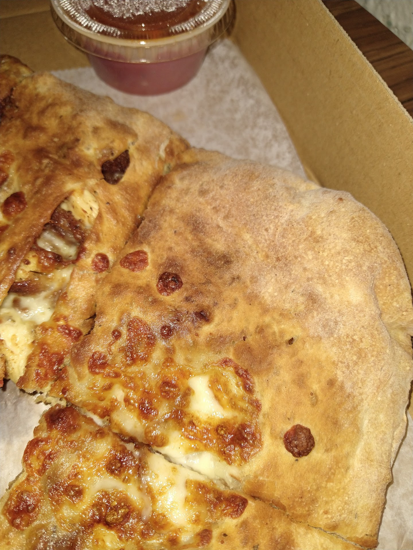 I've ordered the Buffalo chicken calzone. It was super thin and almost pathetic. The crust and dough had no body to it. It was flat unrisen, dough with chucks of overcooked chicken which was very dry and so it gave me the impression that this was precooked (possibly left over chicken) and they threw some generic hot sauce on with the smallest ammount of cheese possible