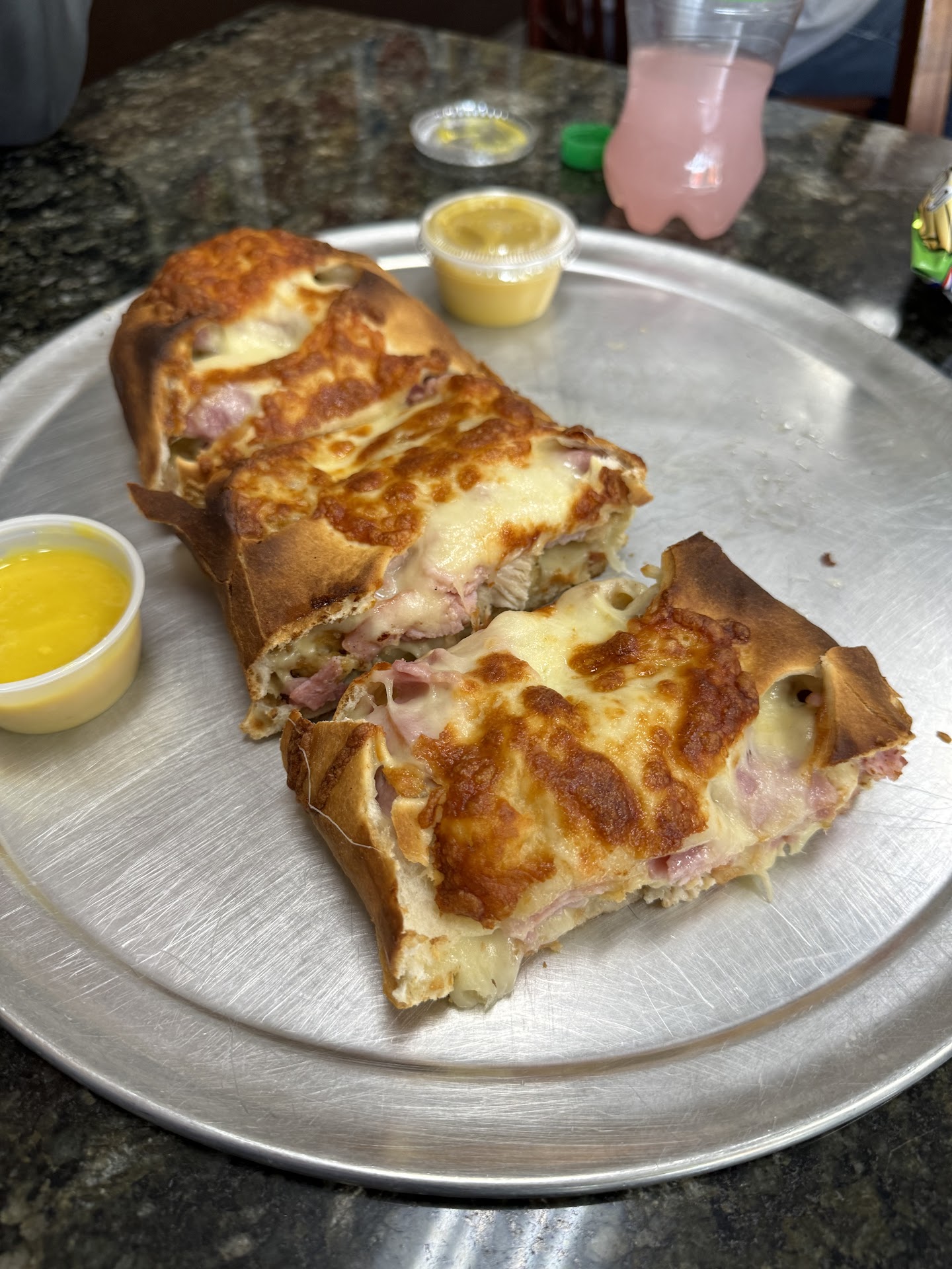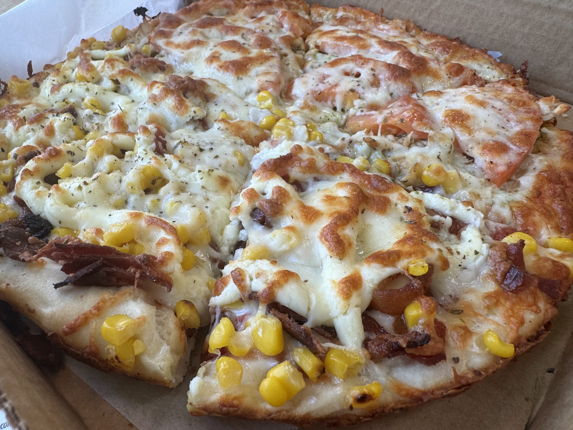 I did half chicken, pesto, tomato, and half bacon, corn, mozzarella, oregano, and Catupiry (a Brazilian ācream cheeseā).