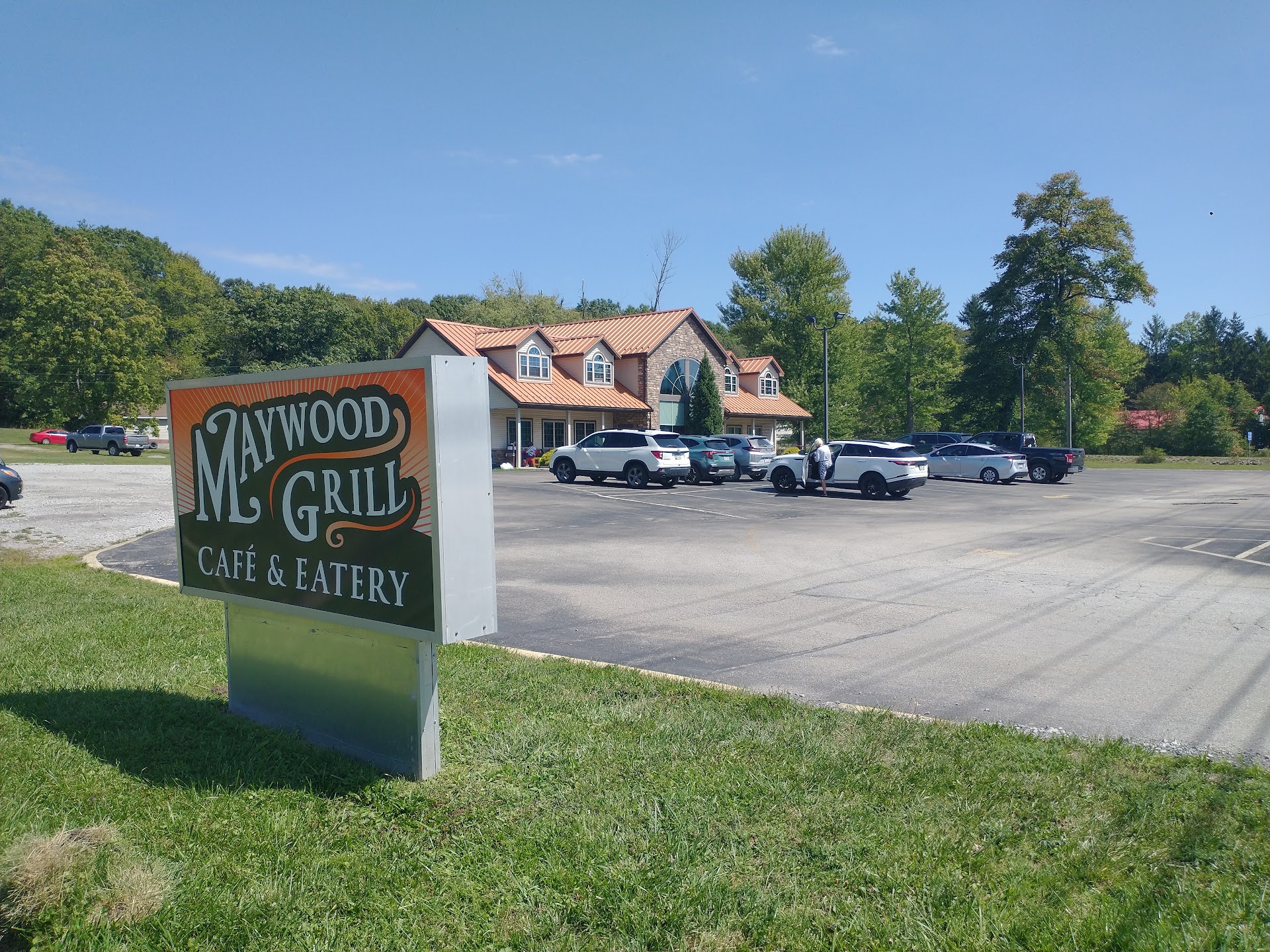 My wife and I were traveling through the area after visiting the Frank Lloyd Wright designed Fallingwater House nearby and just happened to see the grill. At first the design of the building caught our eye but then we realized that we were hungry and needed to drive a distance to our night's stay and that the Maywood was as good as anyplace to curb our appetite. At first we thought that it might be a little high on the hog for our liking but that was dismissed as soon as we walked in. There was a large foyer with plenty of seating, but only a few people waiting even on Friday evening about 6:00. To the left was a bakery with a few seats and plenty of delicious looking offerings and to the right a large very clean open dining room with what seemed a very family friendly set up. We were seated within minutes after arriving in comfortable seating. The menu is hard to describe, as it had a wide range from duck to meatloaf to large salads and specialty pizzas, all with reasonable prices. I had the Shepard's Pie and my wife had Salmon. Portions were large and very flavorful. As we enjoyed our dinners we couldn't help but notice the wonderful desserts that were floating around the dining room. There were individual sized apple and coconut cream pies and a super sized multi-layer Buckeye Cake (moist chocolate cake with flavorful peanut butter icing with a buckeye candy on the top). After our meals we chose THE CAKE and ate it later down the road. The service was very good- knowledgeable, friendly and helpful but not hovering over you. All in all a very nice dining experience. This little town is lucky to have...