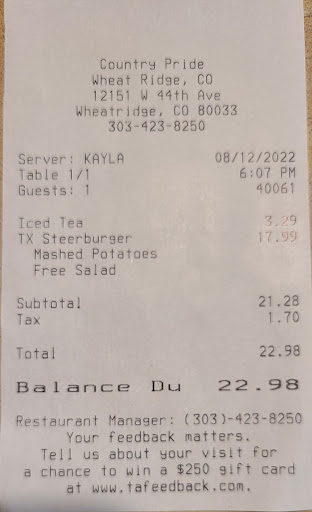 Read moreWaitress could have smiled more and could have had a better attitude especially as a waitress, if you don't like your job find a different job. Then 1 of the waitress has her kids behinde the counter and trying to keep them from being seen. I understand there could be a reason why she has them here, but at work it's not what a customer wants to see. Took over half a hour to get our food. The place was nearly empty and the cook was very slow. The food is not as good as it used to be, ordered the Texas steer burger which was supposed to come with sautéed onions, mushrooms and gravy. But it only came with the mushrooms and gravy. The salad bar is gone, still ordered a side salad ranch dressing and it showed up with some other dressing.... When asked about the ranch I was told they where out, so why not ask instead of bringing out whatever. The floors was sticky. Country pride has gone far down hill and will be the last time I...