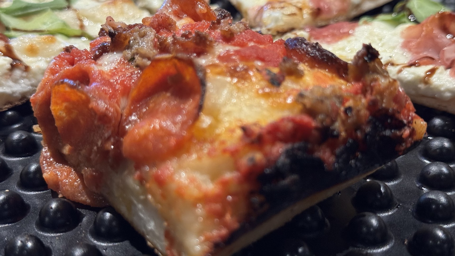 When I went, I took my server’s recommendation and ordered a GOAT pizza on thin crust and a pepperoni with hot honey pizza in pan style. The flavors on both pizzas were excellent. I especially liked the goat cheese with fresh arugula and balsamic drizzle. However, I found the thin crust to be doughy and chewy rather than the crispy texture I was seeking. The pepperoni was a perfect example of a Detroit style pizza with the caramelized edges.