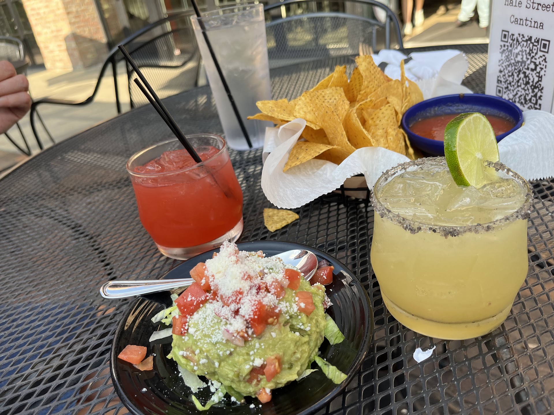 An outing with a friend. We started with guac and margaritas. The guacamole was light, heavy on the tomatoes, and blasΓ©. The blackened tacos were good and the elote was excellent The Margaritas were ordinary, no kick to it.