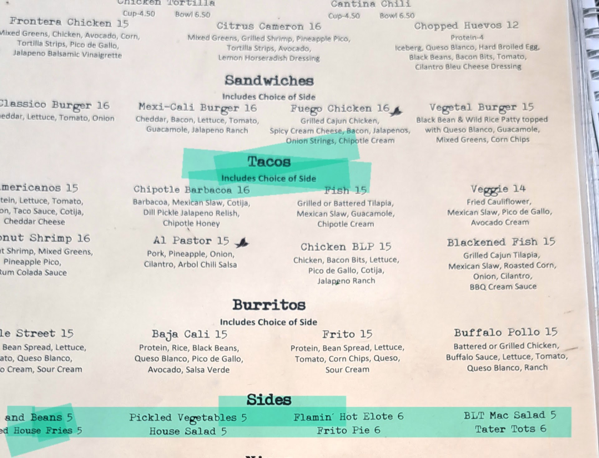 The food, we had fish and chicken tacos, was a little better, but not much better than a year ago. For me they were blah, lacking spices and savor. My friend, on the other hand, likes this place very much, she is more of a bland tastebud woman.