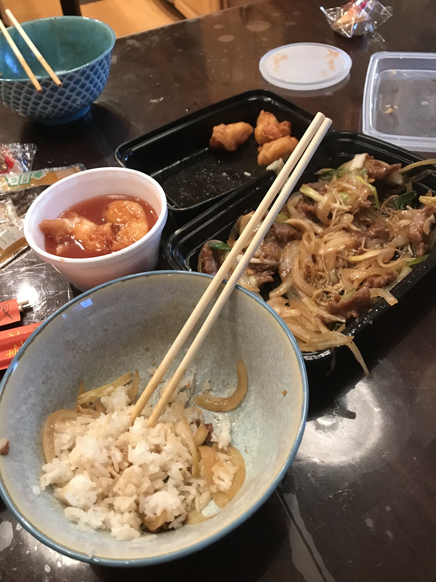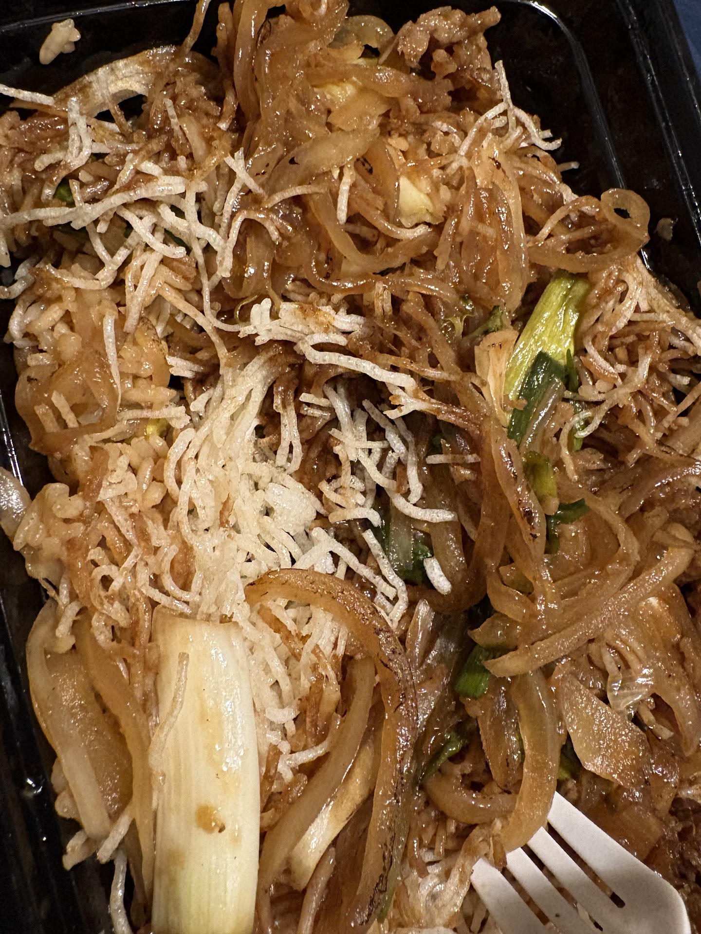 Here is the catch. This Mongolian beef has less than 2.8 oz of beef in the container. (Yes I weighed it out on a scale) Maybe 5-6 tiny pieces at most, the rest of the container is all filler of onion, and crunchy fried rice noodles. Could you imagine if kept the green onions in the order, I might of have gotten less beef!!