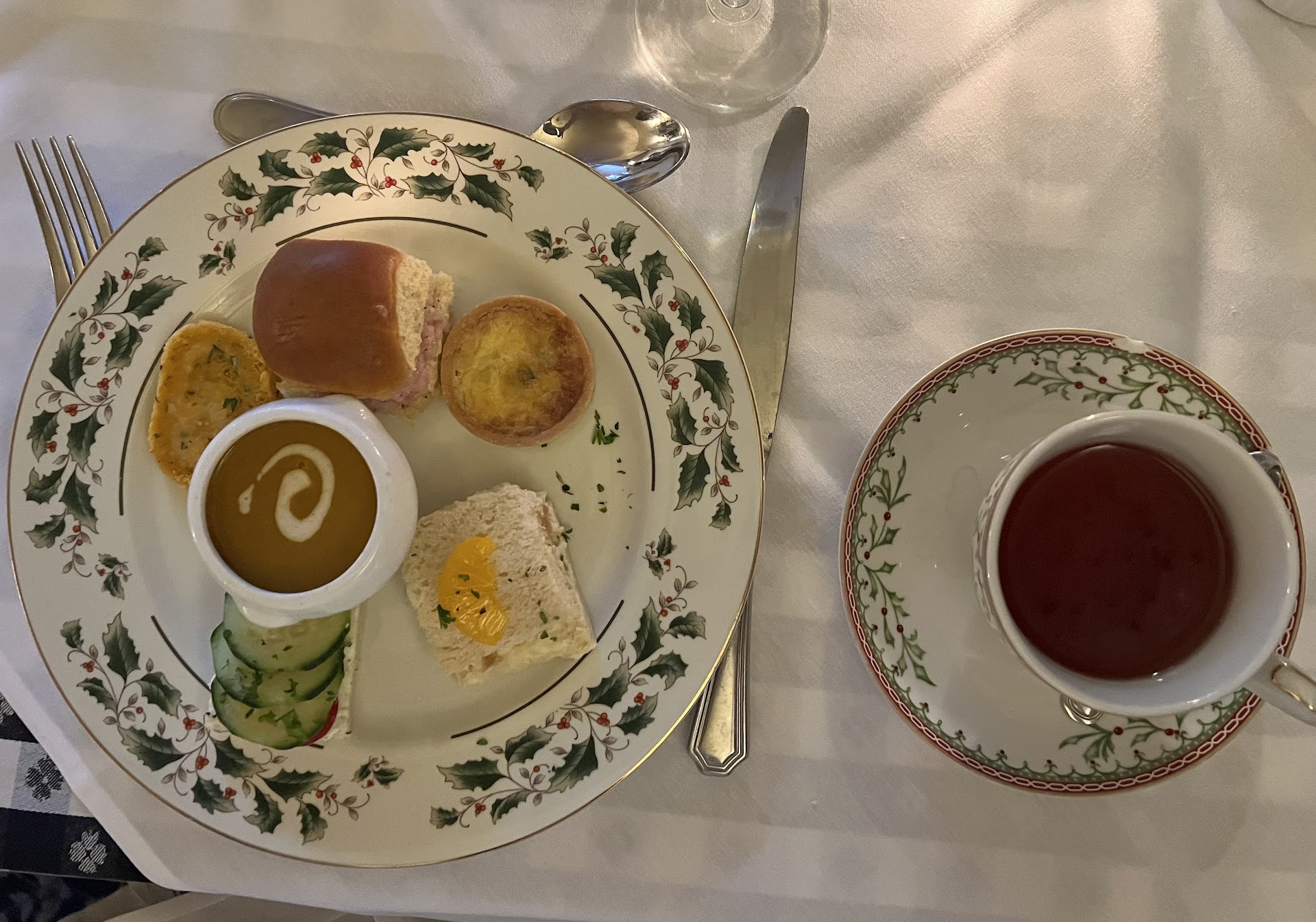 Terrible experience for Christmas tea. From getting a reservation through every point of the 2-hour tea, the service was just short of openly hostile. I called for a reservation in November. I had to call a few times on different days to get ahold of someone. When I finally spoke to someone, the person was so rude, sighing that I wanted a reservation. I made it clear on the call if they were already booked, no worries! I get it is a busy season and so hard to get staff right now. She said no it was fine (yikes). She asked if there were any dietary restrictions, I mentioned that I was vegetarian, but it was ok not to do anything different since I know it is a preset menu. She was clearly irritated that I existed, but said they had a different menu. I chalked it up to a bad day, and moved on. When we arrived for tea on Saturday (20 minutes before the service), I found only steps into the restaurant. I looked for signs to a wheelchair entrance but found none. I tried calling several times, but got no answer. When my friend arrived she went in to ask, and we were sent around back. It is in a courtyard with an open sewer, and a car blocking the way to get in. I was able to barely squeeze past and my friend lifted furniture out of the way. The door was locked and we waited and waited in the cold for someone to let us in. Another patron sitting at a table tried unsuccessfully to flag someone down too. Finally someone opened the door, and immediately barked at us that we should have told her we were coming (after I'd waited in the cold for nearly half an hour). My friend patiently explained that she had just been inside asking. I also explained that I tried to call. The person just huffed and said here this table is special for you (lol clearly not since you were just yelling at us for not telling you we were coming). It was a table near the bathroom with servers rushing past and faraway from what looked like a lovely set up with a piano and centerpieces in the main area. After several minutes, someone stopped by and asked us what tea we wanted. No listing of any options, no welcome, nothing. We rushed to try to pick something since it was clear the server only had a few seconds. We had to ask for cream and sugar. Unlike many of the nicer establishments, the sugar was just dumped in packets on the table. There was not even enough regular sugar. The tea was not steeped for long enough and was just poured. No pot was left at the table. Then the server came by and dumped the first course. No presentation, no explaining what each item was, nothing (this was the norm throughout). Mine arrived with the meat portions. At this point, I was not going to say anything and just get through it, but my friend caught the server before he ran away and reminded him that I was vegetarian. He just took the plate back and arrived with a new plate several minutes later. All they did was replace the meat parts with extra cucumber sandwiches. I couldn't believe it. Why bother asking (and, frankly, implying there were actual alternatives) if you don't actually do anything different. I scarfed down six tasteless, stale sandwiches since I'd driven an hour and half to get to this stupid tea and was starving and cold at this point. The quiche was fine. Probably could've gotten the same thing at Costco. Even though servers were rushing past our table, we had to routinely flag down anyone to get seconds of what they were serving. No one ever came around with more tea, so we had to wave someone down to ask (and at that point we had to ask a few people just to get a single refill). The scone course was great. Fresh and warm. Delicious. No seconds were offered on that. The final dessert course was ok, nothing special. But again, I would've liked to actually drink tea with the cookies, but it was hard to get anyone's attention. I hesitated to write any review, I get times are tough and there are off days, and patience is needed. But this went so beyond that. The service from reservation to when the check was thrown on our table was just...