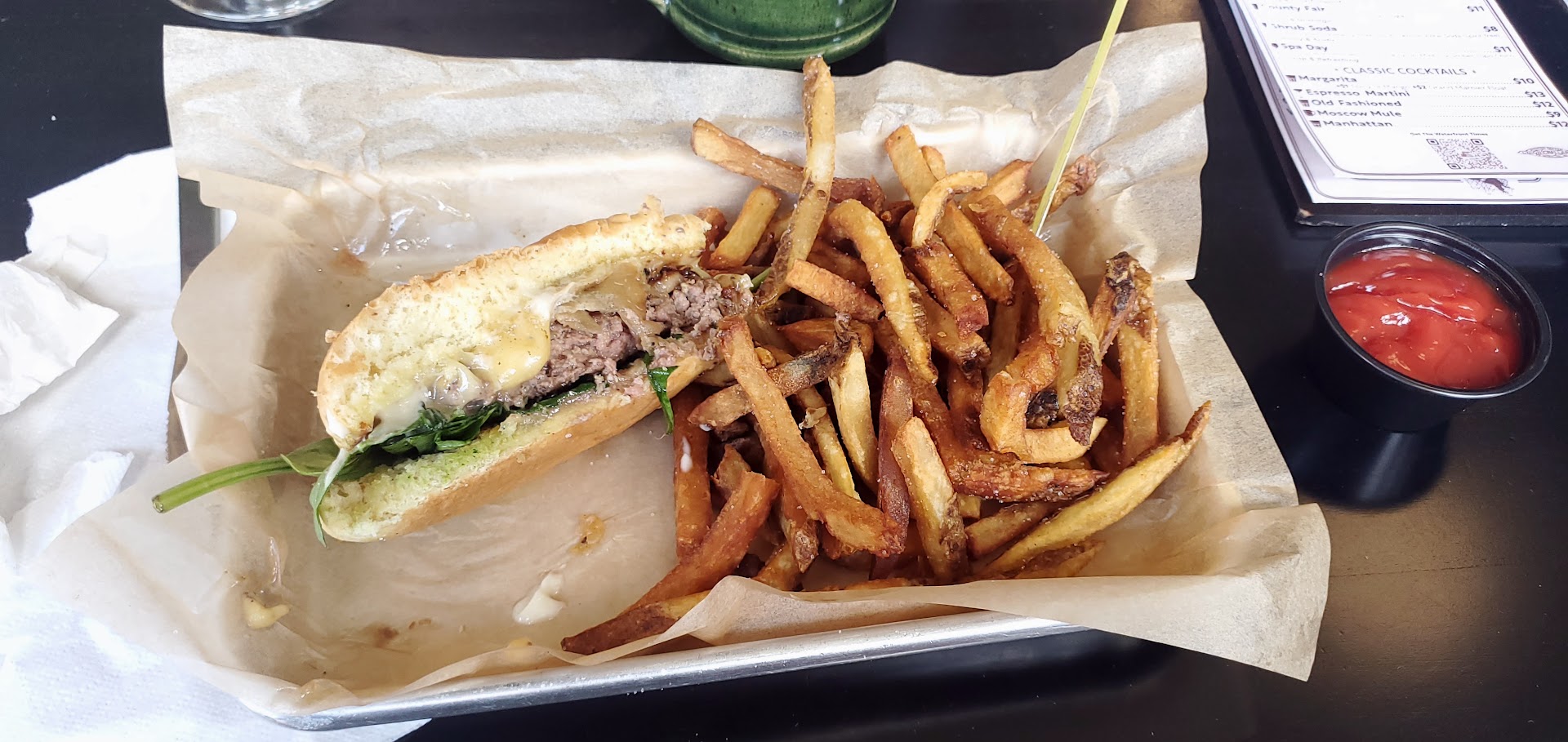 I ordered the gouda burger with fries, a cappuccino, and two mixed drinks: the Zen Garden(spirit-free) as well as the Kokomo.