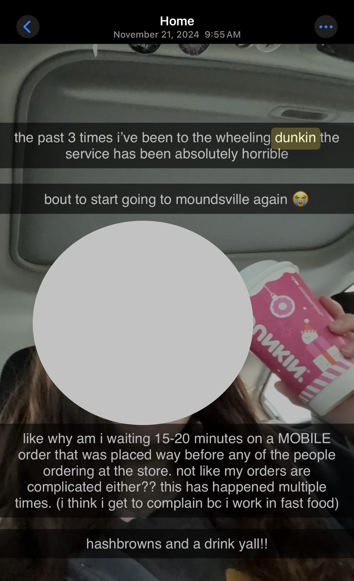 This is quite possibly one of the worst Dunkins I have ever been to. It is sad that it’s only 10 minutes from my house but I would rather drive the 25 minutes just to go to the one in Moundsville. I used to get Dunkin almost everyday, but the service here has gone downhill. Let’s start off with the fact that someone left A WRAPPER in my bacon egg and cheese wrap and served it to me (picture attached). Needless to say, I have never ordered one since and check all of my food before eating it now. My drinks taste horrible all the time. How hard is it to make a coffee when you work at a coffee place!!!! Don’t even get me started on placing mobile orders for inside pick up. There have been times where I have waited over 10 or 15 minutes on a pick up order that was legit a drink and donut or a drink and hashbrowns. How is this possible when I see people coming in and ordering at the counter or going through the drive-thru getting their food before me even though they placed their orders way after me? And it’s no use trying to get any of the workers’ attention because they all just look at you and keep doing what they’re doing/ignore you. I decided to give it another chance yesterday during my work lunch break. I ordered a drink with a grilled cheese as a mobile pick up and waited 12 minutes before I finally watched an employee come over and sit it on the mobile pick up stand and say, ”Oh I’m sorry, someone put this over in the drive-thru.” That’s all fine and dandy, but not only did you guys waste over half of my lunch break, not a single employee (out of at least 5 that I watched walk by) stopped to ask me if I needed something as I was standing right in front of the counter looking at them… DO BETTER!!!!!!!! And don’t say that I don’t understand what it’s like to work there because I actually work at one of the busiest fast food restaurants in town and have for the past 4 years :) The amount of complaints I’ve heard from friends and other people I know about the service at this Dunkin is unreal. Just a couple photos I found from my experiences. They’re date and time stamped too. The service here has been an...
