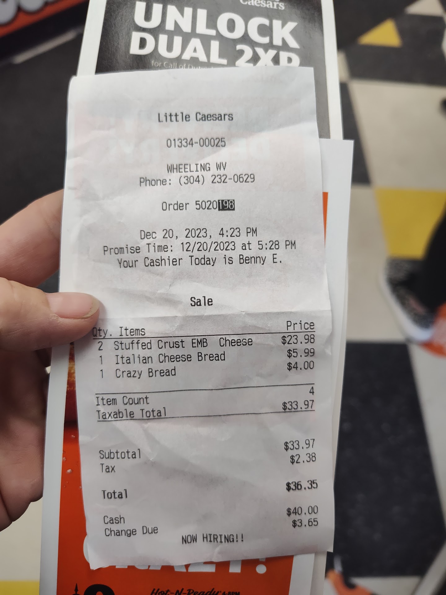 Read moreThey are over charging more than the prices they advertise! I went to order online and it wouldn't work so I called in and went to pick up my order. She gave me my total and it was $5.35 more than if I ordered online. I asked about it and she said she didn't know why and couldn't help me then turn around as if I was asking something crazy. After comparing the online order and my receipt I saw they are over charging on the pizza. They even have advertising that shows the price it should be. I asked her again why she was charging more than the advertisement and she said she didn't know.