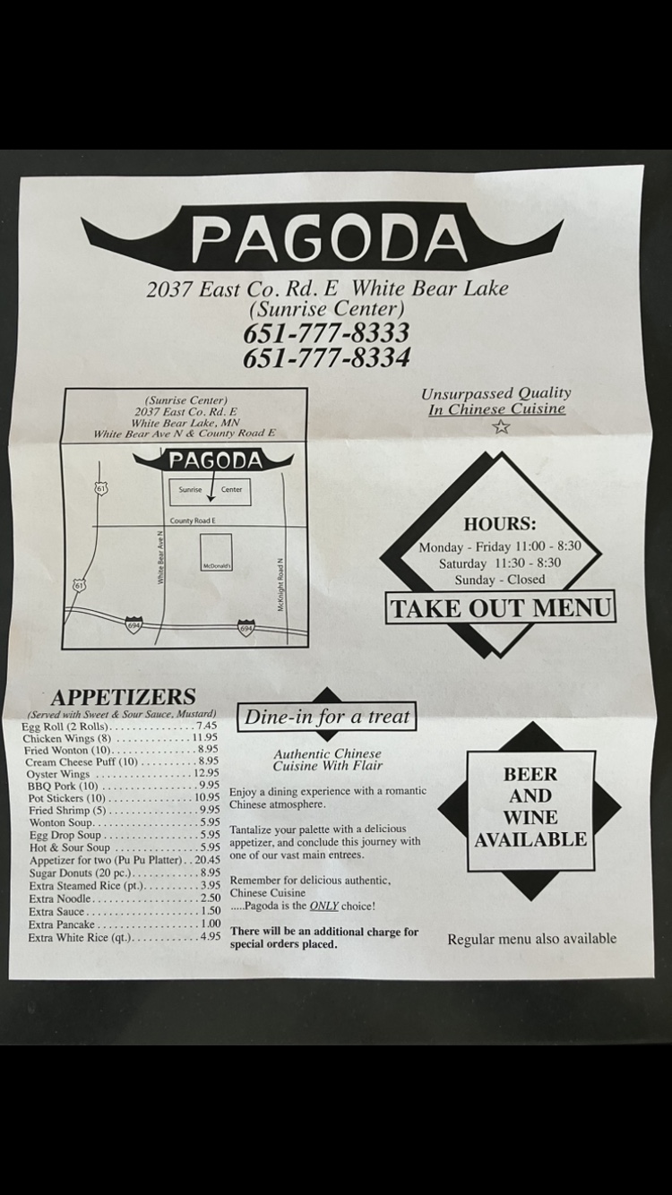 What!?! No chop sticks, no napkinsâŚ.Egg roll looked good, but inside not so good. Couldnât tell you what what inside, but it was soft and undistinguished, so I couldnât tell you what veggies it had and/or if it even had meat price is $8.95 for two rolls, wouldnât recommend the egg rolls. $12.95 shrimp fried rice, had a shrimp in every 4th bite, so I think it was lite on shrimp compared to my (far away from work) favorites , literally had to spit out a shrimp, because it tasted funky spoiled. Also ordered sesame chicken +another $21.95 and disappointed in the more breading than chicken than breading and a weird sauce. Sauce had a twang and breading was thick, soft, and soggy and donât remember seeing any sesame seeds, so maybe she got my order wrong.. I bought this much so I would have som left overs that I could have over the weekend. EPIC FAIL AND LESSON LEARNED, to not buy for leftovers till I know the place is worthyđ I was super hungry and usually that fact gets an extra star because it is so satisfying to be full. I wonât recommend or go back to Pagoda. Had tables barricaded at the door for take out. No table restaurant dining. No chair to sit and wait for your order (I stand all day at work). Probably not gonna let you use a bathroom if neededâŚ.and location is in a beat down old strip mall location. đŹđ $36 lunch, best serving was to remind me âanything is possible with faithâ in my fortune cookie (except a decent Chinese lunch...