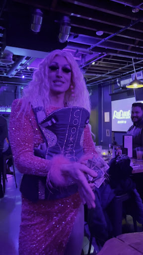 There was a small television over the door to the other, more occupied, main room, which show ads for events. The ones I noticed were karaoke, but spelled queeraoke, and some kind of fetish night.