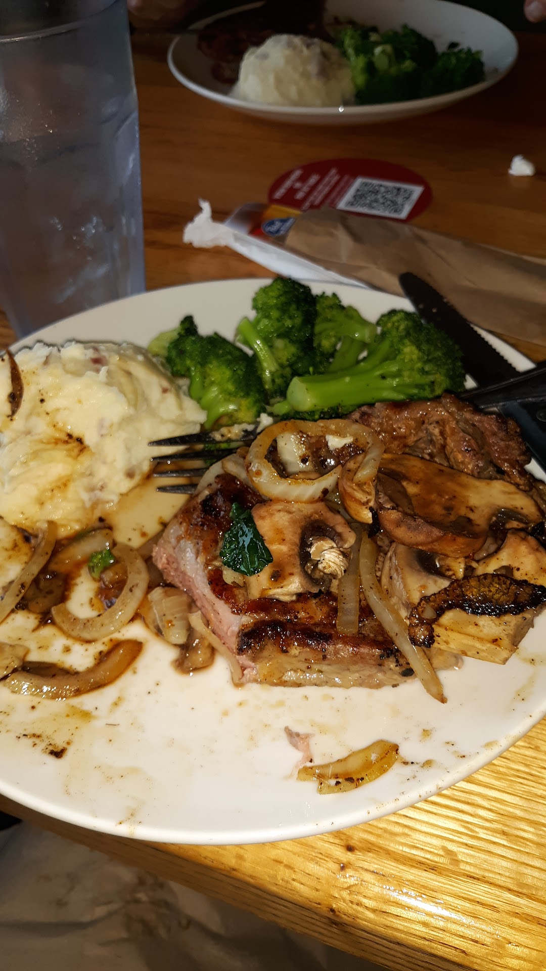 The Applebee's location where we typically went closed so we gave this one a shot. Overall, I'm not a fan of the chain in general. However, the husband chose the restaurant so there I was. I decided (after much back and forth) on the Bourbon Street Chicken and Shrimp with fried red potatoes, sautéed onions and mushrooms. The picture on the left is the menu photo. The picture on the right is the actual brought to the table. Close but no prize. The skillet was not sizzling when it arrived which should have tipped me off right there that I was about to be underwhelmed. The onions were warm at best, not sauteed and still crunchy. There were mushrooms, although I had to dig for the 4 I found. The potatoes were not cooked through and under seasoned. The chicken was good, but the garlic and thyme butter was just a cold mound on top of the shrimp. I had to tuck it under the chicken and find a warm spot for it to melt. Oh yeah, the shrimp.... blah. Overcooked, under seasoned and nowhere near "blackened". Overall the entire dish was under seasoned (compare the pictures - the menu picture, the one on the left is beautiful). Could I have complained and sent it back... yeah, if I wanted to wait another 20-25 minutes for them to redo it while my family ate and then have my family wait while I ate. Not ideal. Could I have sent it back and asked for it to go... thanks, but no thanks. Ah well, it is usually a few months before we lose our minds and think "hey, let's go to Applebee's for dinner" so maybe by the next time, the cooks will have a little more training to at least come close to what the...