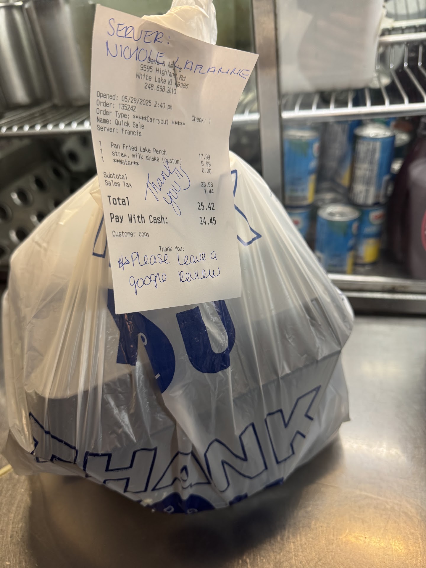 Read moreGood food, good menu selection, fast and friendly service. Some recommendations though: (1.) The Perch sandwich needs more Perch, the fish should be falling out of the sandwhich...my wife got the sandwich and although tasty...the fish to bun ratio was off, just two tiny pieces. We are in a state surrounded by 5 lakes stocked with plenty of Perch...shouldn't be that hard to get plenty of Perch to stack that sandwich and still make bank. (2.) Stop putting 2 straws in each drink and giving us 2 new straws every time we get a new refill...we had 9 lemonades between us and had 18 straws!!! The plastic waste must be outrageous, and the cost to the restaurant? Switch to a wider straw or go with paper or compostable straws, and make customers reuse the straw they already have.