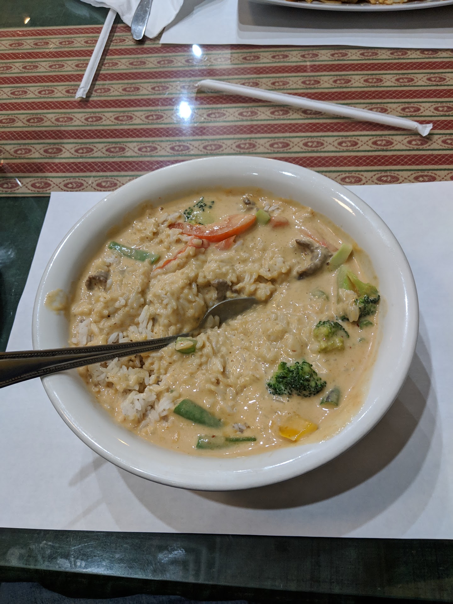 I ignored this place for years. I assumed this little joint located in the strip mall adjacent to a pet food store and Leo's coney island, was another "#5 combo with fried rice and a spring roll" places. Man, was I missing out.. First of all, the owner/chef is right off the shores of Thailand and, after several visits you find out her husband is a veteran. Reason #1 to support this local small business. She is very, very picky, so picky that she generally won't let anyone else cook. Everything is made very fresh while you wait a very long time. I've gone in at 4:45 on a Friday and had my meal within 1/2 hour ish. 6pm or later? Forget it. I've waited 2 hours for food, and I don't care. It's that.damn.good. CD11(catfish curry) is only available at the dinner service time and is worth every noise my stomach makes waiting for it. This place is tiny! So damn tiny I'm amazed it hasn't occurred to any of the impatient previous posters that there is probably very limited space in which to hold pre-prepped items so that is why stuff is always made to order. And you have to build a curry. It's not coming out of a carton from Gordons Foodservice. Love goes into it. It's definitely not a place I'd take small children or my whole family to, but it is a great place for date night, a business meeting, or place to meet up with friends and actually engage in each other for an hour and a half or so...