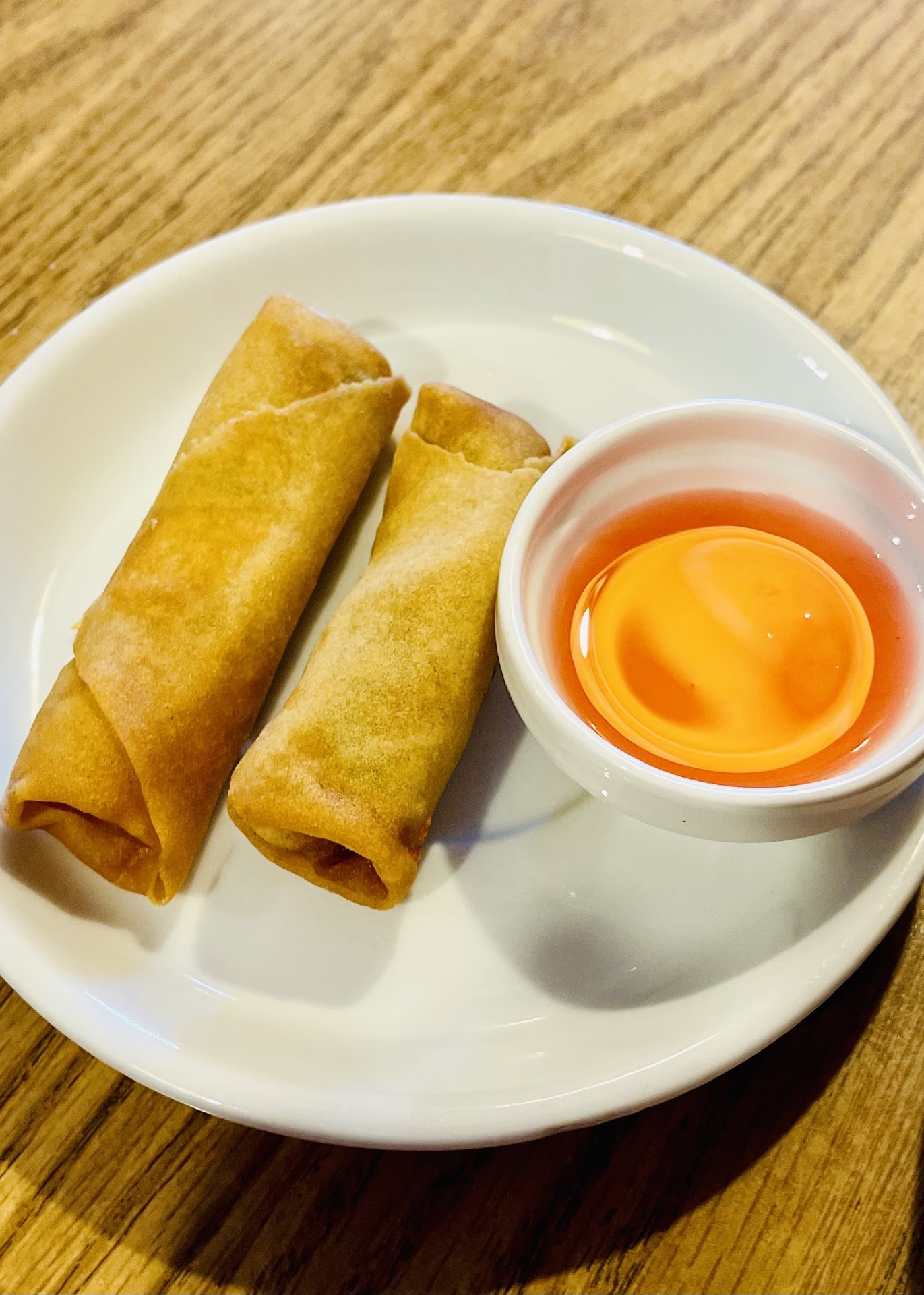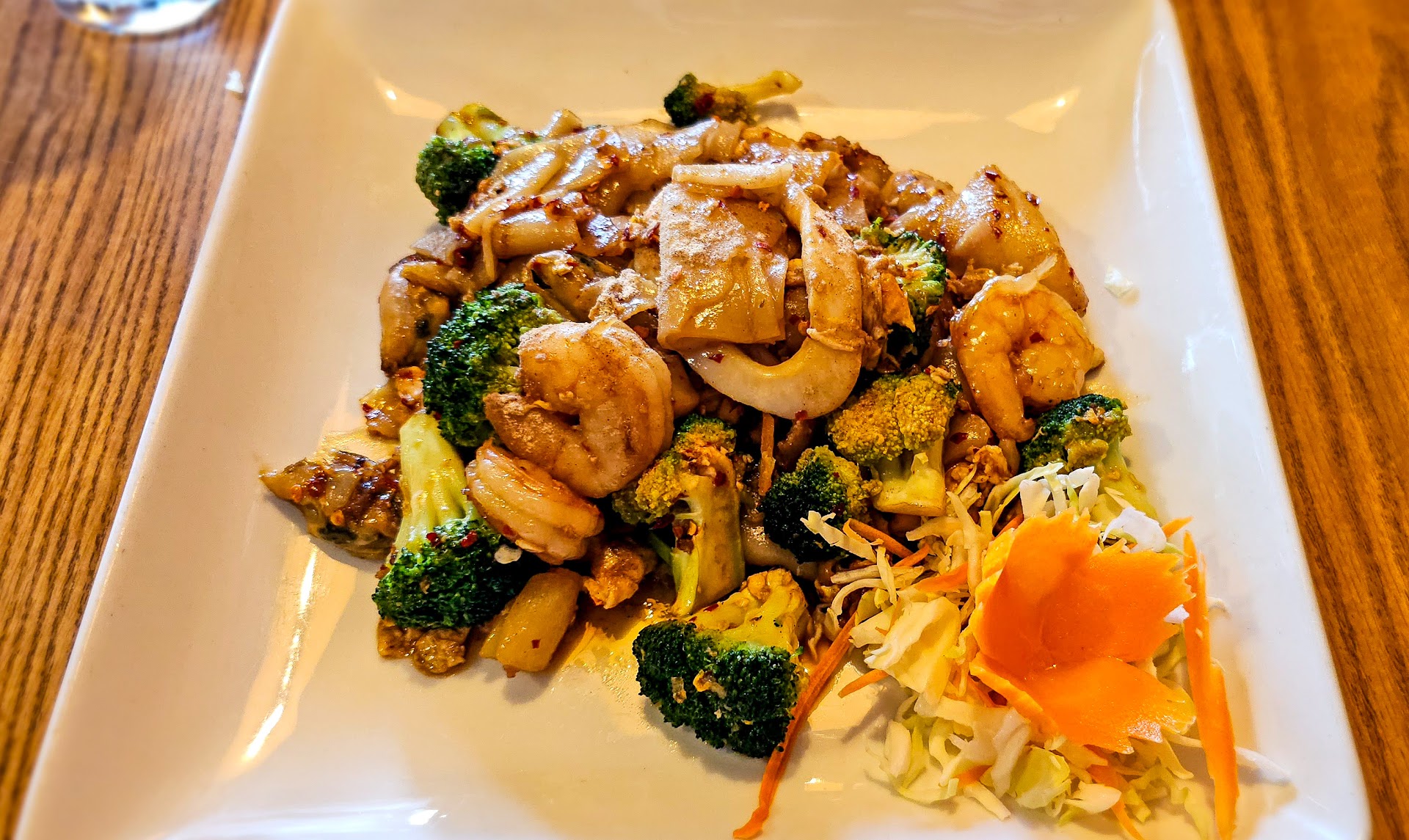 Heeding the advice of fellow food enthusiasts and our attentive server, we embarked on a culinary journey with the Thai Style Orange Chicken, Shrimp Fresh Roll, and the Seafood Pad See Ew—extra spicy, naturally. The Thai Orange Chicken, with its delicate, crispy batter encasing tender chicken slices, drenched in a tangy, sweet, and subtly spicy sauce, was much unlike any Americanized orange chicken I've chowed down on at the local take out spots. It stood out from any orange chicken I've tasted around these parts and was unique; in a really good way!