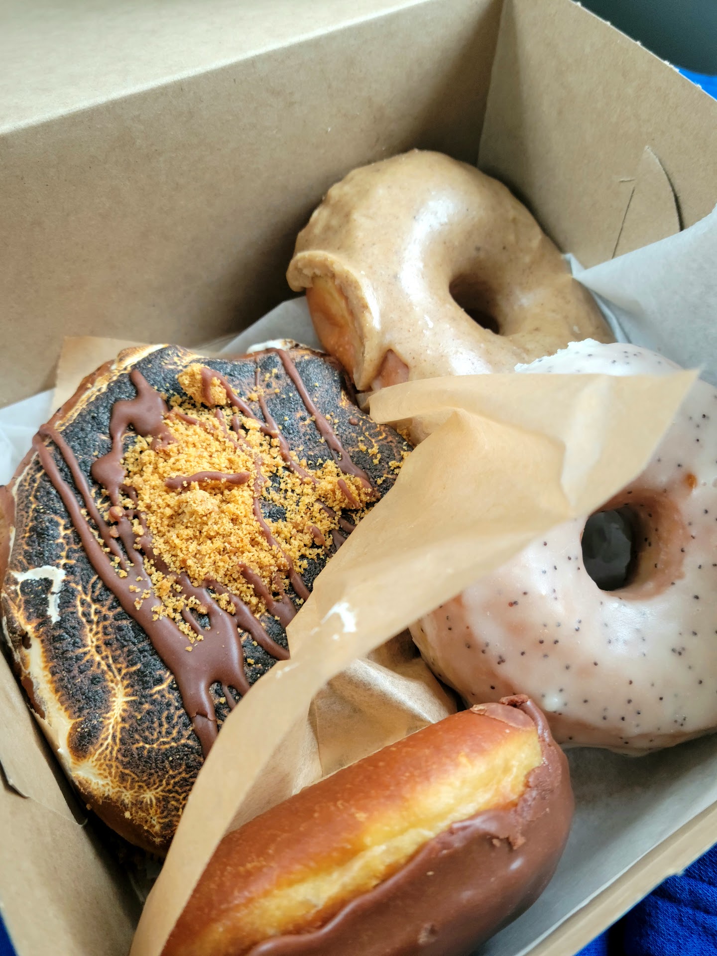 As for the donuts we tried the cinnamon toast donut, lemon poppyseed donut, chocolate stuffed with vanilla buttercream and s'mores fritter.