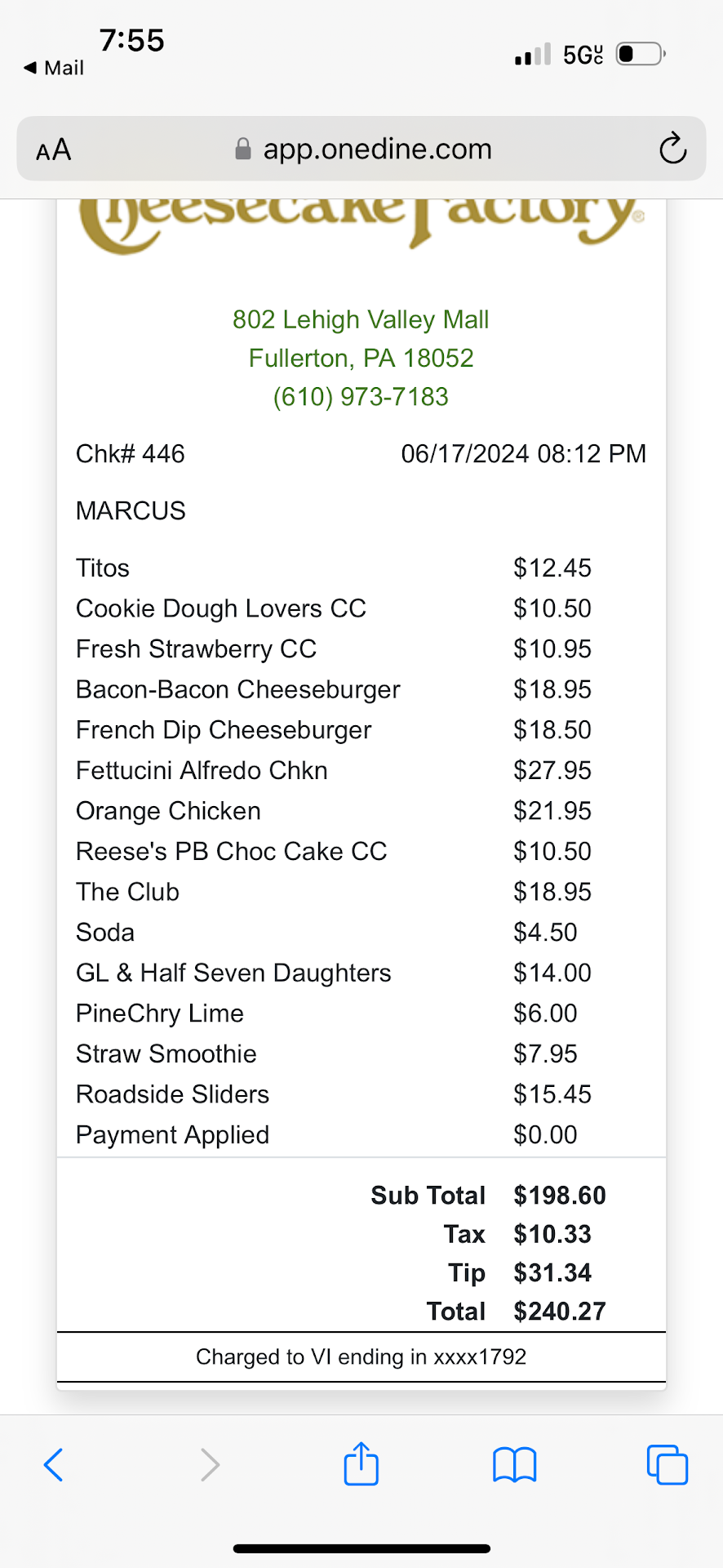 this is more of an individual review, that leads into an overall review of a dinner that happened on Monday June 16, 2024, between the hours of 8pm and 9pm. It was a party of 5, 3 adults and 2 teens. We walked in and were immediately greeted by the hostess, she sat us at a large booth, which was comfortable, our server was Marcus, which before we even got to the table, he was accosting us if we wanted bread to start off with. Upon seating us, the hostess took the extra place setting and utensils away. The first thing we noticed was that all of the utensils, that were on the table were badly water stained/spotted, almost as if the were not completely washed, like ran a rinse cycle and then had heat applied to dry because they were out and needed to set more tables. Upon noticing that, we asked for the manager “Adrianna” to come to our table, our server Marcus, took the drink order, then went and told her, as we watched him tell her we requested her to come to the table. Then bread came out, and the 2 slabs of butter that came with the bread baskets, were practically frozen and you couldn’t even shave anything off. Then we noticed we had no cloth napkins as all the tables around us did. Marcus came back to take our food order, and we told him, to which his action was to get us regular napkins, and for 5 people, only leave 3 at the table. We ordered our food (up until now still no manager), I ordered the Club, my partner ordered the orange chicken, our friend ordered the French dip burger (well done), one daughter ordered the bacon bacon burger (well done), and the other chicken Alfredo… the food comes out, but a food runner is bringing it to us not our server, which is fine,but not all at once but we still haven’t seen Adrianna. I had the most basic cannot screw up order, the club with fries…. My fries were cold, the club was ok. The orange chicken came out looking good and tasted good. The chicken Alfredo, she said she liked it..HOWEVER, the French dip burger was more of a medium rare/medium temp, and the bacon bacon burger while it was almost well, came out with ketchup pre dispensed on the bun, no where on the menu, and I triple checked, does it say that the burger is served with ketchup on it. We sent back the BB Burger, and again at this point still no Adrianna, which, seeing as we had a item sent back, Normal practice would be for a manager to bring out the new item, and make sure it’s ok. NEVER happened, no manager came by at all to check on the re cooked burger or even to ask how the meals were. Also, it’s important to know, Adrianna was watching our table as we could see her from the server station she was attempting to hide behind. So about this burger, the redo finally came out, just in time for everyone else to be done with their meals, and the teen girl, not be able to eat with everyone else.. we get the bill, and it’s over $200 for a server that was ok, he would do great at Olive Garden, and a manager, that refuses to speak to guests. I’m not even entirely sure the stance that TCF takes on when guests or better yet PAYING customers ask for a manger, and no one comes I know at any other establishment when you ask for a manager you atleast have one come by, even if it’s not the one you requested. I am not sure what clown school you hired Adrianna from, but she doesn’t need to be working at an establishment such as this one with as much presentation of class as Cheesecake Factory tries to have. If this were one of the mystery shops I had done in the past, I would have made sure to see that she was retrained on the floor on how to greet guests, and make sure that they had a good experience. Due to Adrianna and the poor experience that could have been better if she would have come to the table, I will not be back, and I will make sure that everyone I know, knows about this experience. Take my word, your money is better spent at elsewhere, you’ll have better food, clean utensils, and...