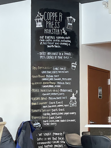My favorite part of Copper Press is its peacefulness. Most of the light coming from the windows in the front, leaving the shop darker than other coffee shops. It feels like you’ve entered a cave, only not a clammy, cramped one. The seating area is one big, open space with generous gaps between tables and couches. It isn’t stuffy or cramped. Most coffee shops today are busy and chaotic. Tables are crammed together, lighting is sharp, and people are hustling in and out. Copper Press did have its share of customers, but still it was quiet and peaceful because of the lighting and space.