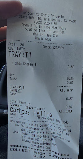 Read moreI just went to the sonic in whitehouse and I ordered a burger with mustard, ketchup, and chili. I got home and the burger had only the meat. It was really disappointing considering I payed a good amount extra for the chili to be put on the burger. As well as this one of the workers came outside with a blank look on her face and just stood in front of our car staring at us before asking where âthe guyâ went. Obviously we had no idea what this meant but she looked very concerned. She continued to pace for a minute asking where he went but again we had no idea who she was looking for. Now I would have no problem helping her but Iâm not getting payed hourly to look for âthe guyâ like she was. Instead I was too busy being distracted by the girl that brought out my food. She stumbled. Started reading my order. Stumbled again and then just stared at me until I finished what she was attempting to say. Really weird experience that lacked professionalism....