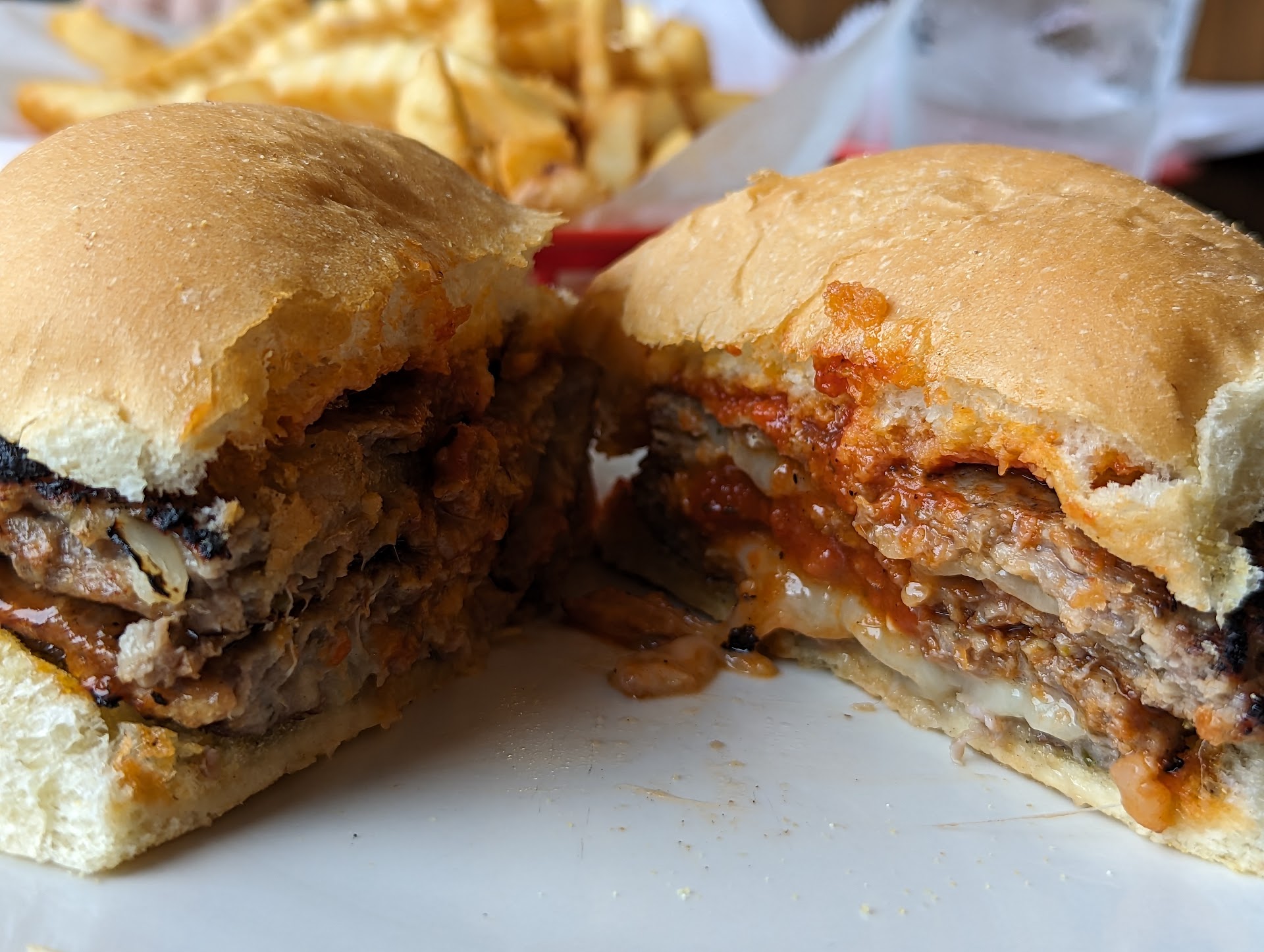 My wife and I recently stopped here for dinner. My first impression was that the bartender was talking pretty loudly with a customer about someone that they both knew, they were saying some rather inappropriate things for a conversation had out in the open for anyone to hear in my opinion. We ordered our meals, my wife ordered the Burger and brat combo with fries, I ordered the Prime rib with baby reds and a cup of soup..... I like to try different soups so I asked the waitress about the Pizza Fiesta soup, the waitress said if you like pepperoni then you would probably like this soup. When we got to our table the soup was there, looking at it I wasn't sure what to think of it, I am still not sure what was in it, but I was fairly certain that there wasn't any pepperoni of any sort in the soup. My wife and I normally share our meals with each other, she smelled it and thought that it smelled bad....