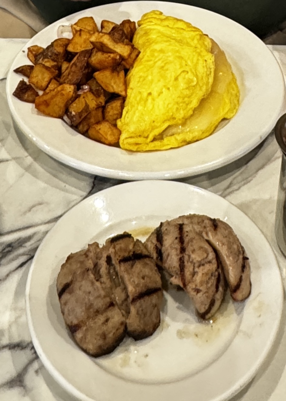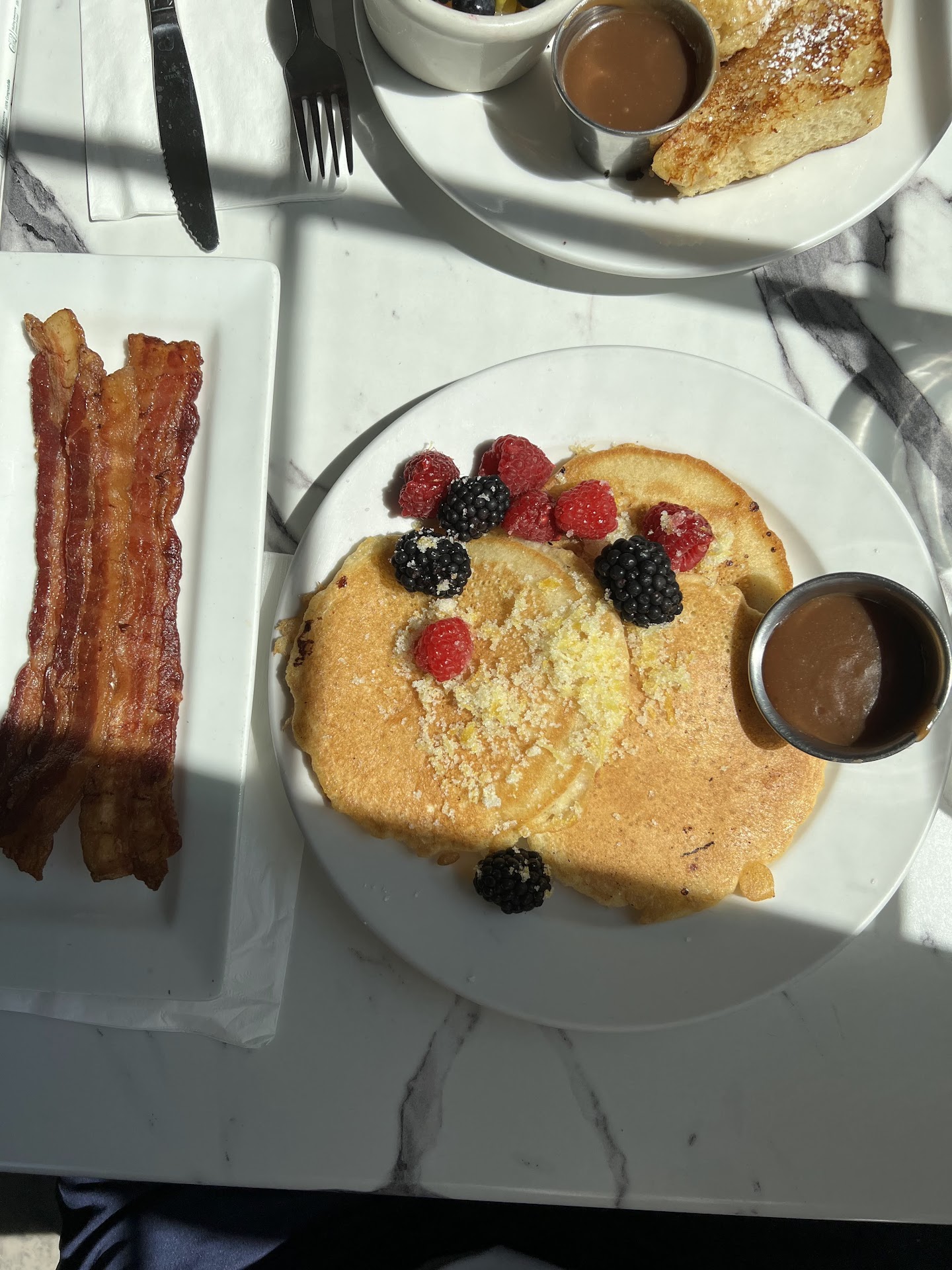 Was greeted by 2 different waitresses after we got seated, asking us different questions and if we wanted drinks when I already ordered them. Then another lady came to ask for our order. Then a different guy refilled my water glass with warm water. I got a small cup of coffee to drink and my boyfriend got a small cup of hot chocolate (plain, no whipped cream or anything). They charged us $3 for each cup, and only refilled mine once the whole meal. And I had to ask for ice water since my refill on my water was warm. It took forever to get a refill and it wasn’t busy at all. I was thirsty too, ended up eating all the ice while waiting for a refill. We ordered chocolate chip pancakes, which literally had like 5 chocolate chips inside each pancake and a few on top- very disappointing they didn’t taste choclately at all, tasted like regular plain pancakes. The Carmel syrup stuff they give you taste like melted butter. He ordered French toast and an omelette which they made into 2 separate meals when he just wanted the omelette as an add on, so he was charged $12 for the omelette meal with black toast that was burnt and hard as a rock and over cooked home fries. Then the French toast was $8 with a small cup of warm fruit. All together, the food was a major disappointment especially after driving 30 mins to get here and reading good reviews and looking at the pictures people posted, experience was much less then what I expected from an upper scale brunch restaurant. Nobody asked us before we left if we enjoyed our meal, which clearly we didn’t. And the lady who kept coming back to ask if we were done to take our plates came back and bothered us at least 3 different times to take plates when we were just trying to eat in peace, 1 time at the end would’ve been sufficient or could’ve waited until we left. We ended up spending over $40 for what was supposed to be 2 breakfast entrees with 2 small drinks, but they made it into 3 separate meals. I will definitely not be coming back here again and would...