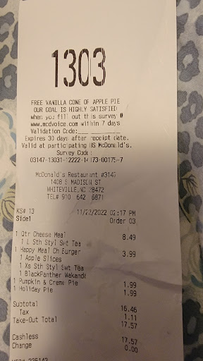 Read moreSo this is the second or third time this has happened which is why I'm leaving a review and leaving my comment on McDonalds web site. I went to the drive through today ordered a quarter pounder meal a happy meal cheeseburger and two different pies. They gave me my kids meal at the window and then as I found out the last time quarter pounder meals are made to order. So I was pulled to the last window and waited 15 minutes from the to bring me the rest of my food and they only brought me just my meal not my pies. So I called inside and the person identified themselves as a manager and I explained to them what happened and she sent said she was sending someone with my pies. This is my lesson learned I didn't look in the bag and and when I got home one of the pies was wrong. As a consumer when I pay for something I feel as though I should get what I paid for not what you want to give. As I said on the phone this is redicolous to wait only to be given...