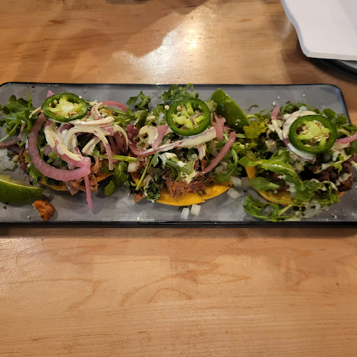 I have read some of the reviews before making my decision to come, just to give it a fair shot. This mexican BBQ theme, I was curious. First at arrival we walk in the shopping Plaza storefront restaurant. It was the Togo side and you wait to be seated on the other side. Simple what I assume to be Mexican Decor, an odd mix of bench and chairs at some tables. Large space able to accommodate big groups. This evening it is only two of us on a Tuesday evening. We were sat in a short amount of time, the place wasn't very busy. What I did notice or lack of was aroma of what I would think is a heavy used smoked equipment running. I did not smell anything close to that. Therefore I had to keep in mind that this may not be the usual american concept of BBQ, so keep an open mind.We started with the tostada flight. 3 tostadas I believe chicken beef and pork, very delicious, full of flavor, and mountain of texture and flavor profiles, very well done. Not in any way a BBQ item but good.My friends burnt ends were just ok she said, I did not like them, presentation great flavor fail. Moving on to the entrée we wanted the ribs but the came back and said they were out. I didn't come here to eat BBQ chicken so my Friend had the brisket sandwich, and I had the hot link combo. To start the food came out it looked delicious and presented well, however, it also came out of the kitchen Luke warm, this is something I read in a few other reviews and I dismissed it. Do not dismiss it. There is no way that my sausage should have been Luke warm even sitting under a heat lamp it should have been hotter, my friend said her brisket was the same. Now to the flavors, there was none on the meats bland. The hot link was not a link but seemed more like Kielbasa. Brisket no flavor we both needed sauce to help along the meal. The Brussel Sprouts were ok, my friend really liked them, I prefer mine without sweet chili sauce all over it. the Mac and cheese that some say was their favorite was, I was not a fan of. I assume it's a jalapeño mac and cheese, no thank you. It's not spicy just supposed to be the flavor I quess. They provided 2 sauces on the table one is I guess the original plain BBQ sauce and the other is the hot. Didn't try the hot but the mild was nothing to jump for either. The manager came by, I assume he was the manager and asked how everything was. I told him the truth, not a fan of the macaroni and the food came out Luke warm. He said oh sorry about that perhaps the kitchen rushed the food out. Thank you for letting me know. ..Honestly on a Tuesday evening, you out of ribs and they rushing food out not heated to proper temps then what will happen on busier days. Mind you the have business people obviously like the place the Togo orders were going out while I was there. I personally am disappointed in what I consumed except the tostada flight, I can't recommend anyone go try it. For real someone sensitive could get sick from that meat not reaching the right temperatures. If the correct that issue at least, maybe some of the people could look past the lack of...