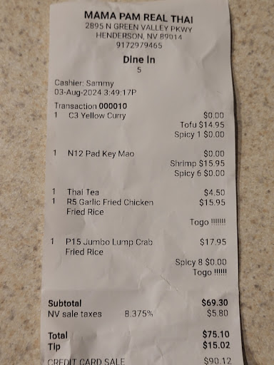 My wife and I frequent Mama Pam Restaurant weekly (either dine in or take out). Today we dined in. Upon entering I spoke Thai to the server/cashier named Sammy (on the receipt). He asked how I spoke Thai and I advised that all of my friends in LV are from Thailand, and I'm practically adopted Thai.