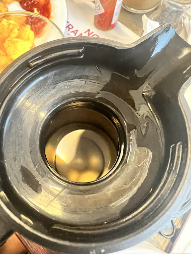 The glasses that were on the table were nasty they looked like they were reused from other guests and never washed. Silver wear was dirty and just handed to us, not in a napkins just handed to us. The pancakes were either burnt or raw or both at the same time. There was a fly in my friend’s drink. The ketchup had some nasty black stuff around the rim. The bacon was so over cooked it would crumble into pieces and could just be snapped in half. The water jugs had stuff floating around in it. We were given hot water that smelled like coffee was light brown as if we were given a coffee pot that was never washed and hot water was just added on top. The eggs were like rubber and just over cooked and nasty. And not to mention when we got our food it was cold, the butter on our pancakes and waffles wouldn’t even melt that’s how cold the food was. The only semi good things that we got were the potatoes and the waffle.