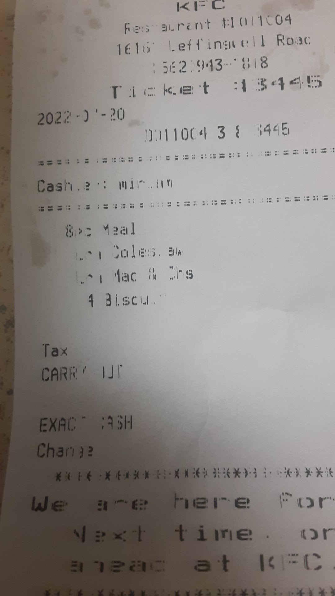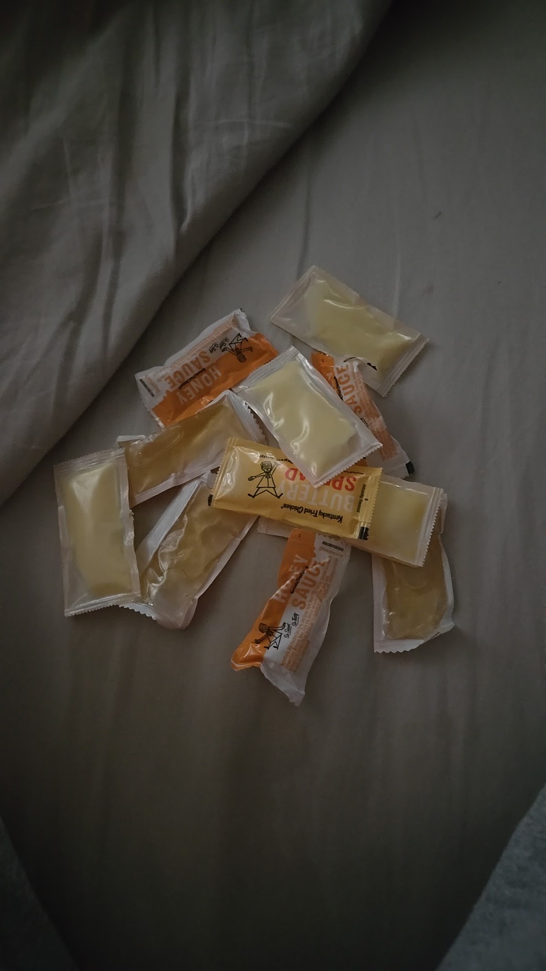 Drive thru order of strips combo with honey mustard sauce...got home and found 6 packets of honey and 6 packets of buttery spread. Dont use either one. Simple order, and someone just wasn't paying attention. This happens way too often. Now, do I drive back to get the sauce i ordered ? Fries are never crispy, always wimpy. Cmon KFC,...