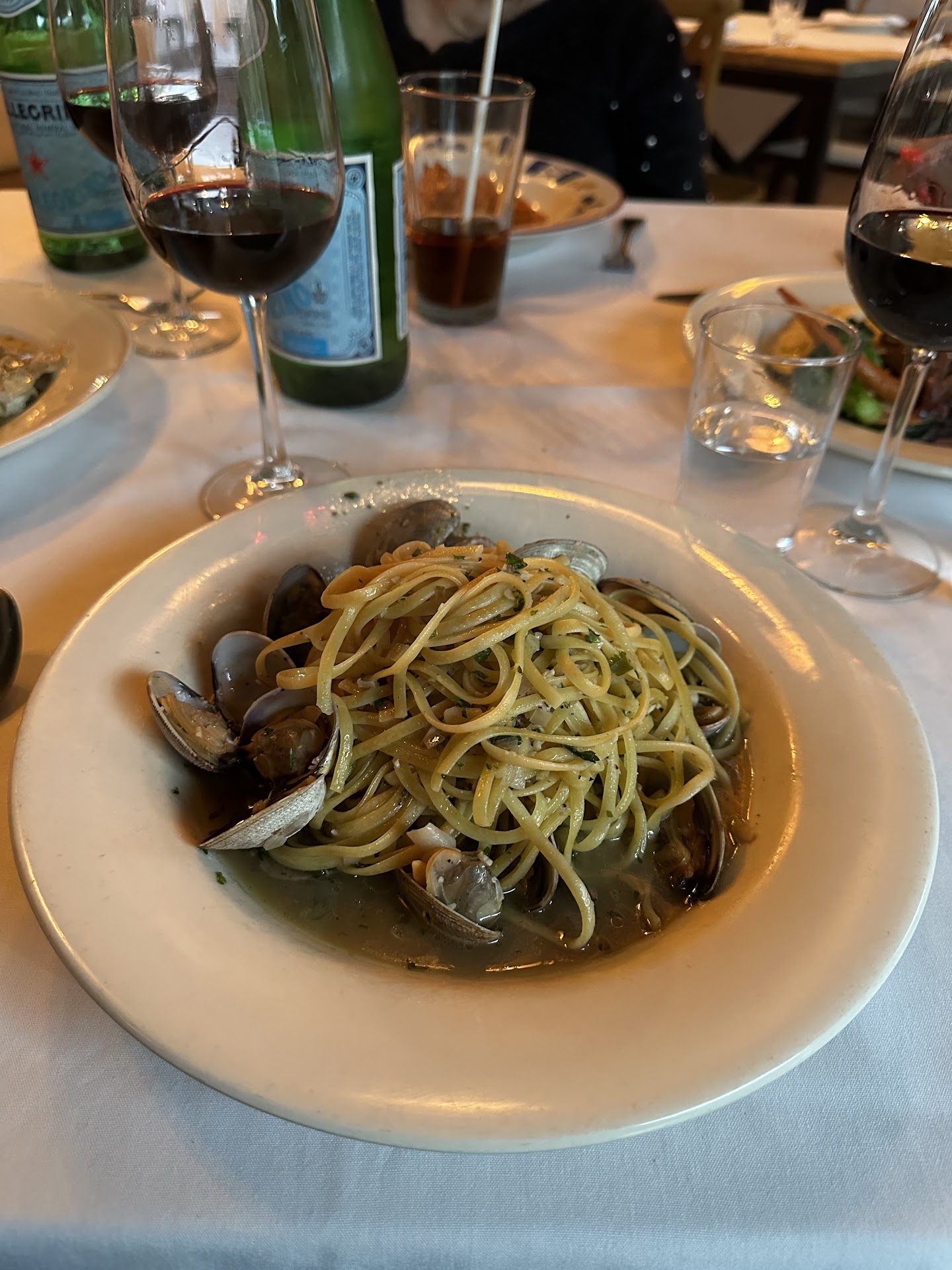 We ordered four entres: 2 lasagna , linguini pescatorre(5 different seafood pasta), and a vegetarian pasta. All were reported to be very tasty. Note: entres do NOT come with sides.