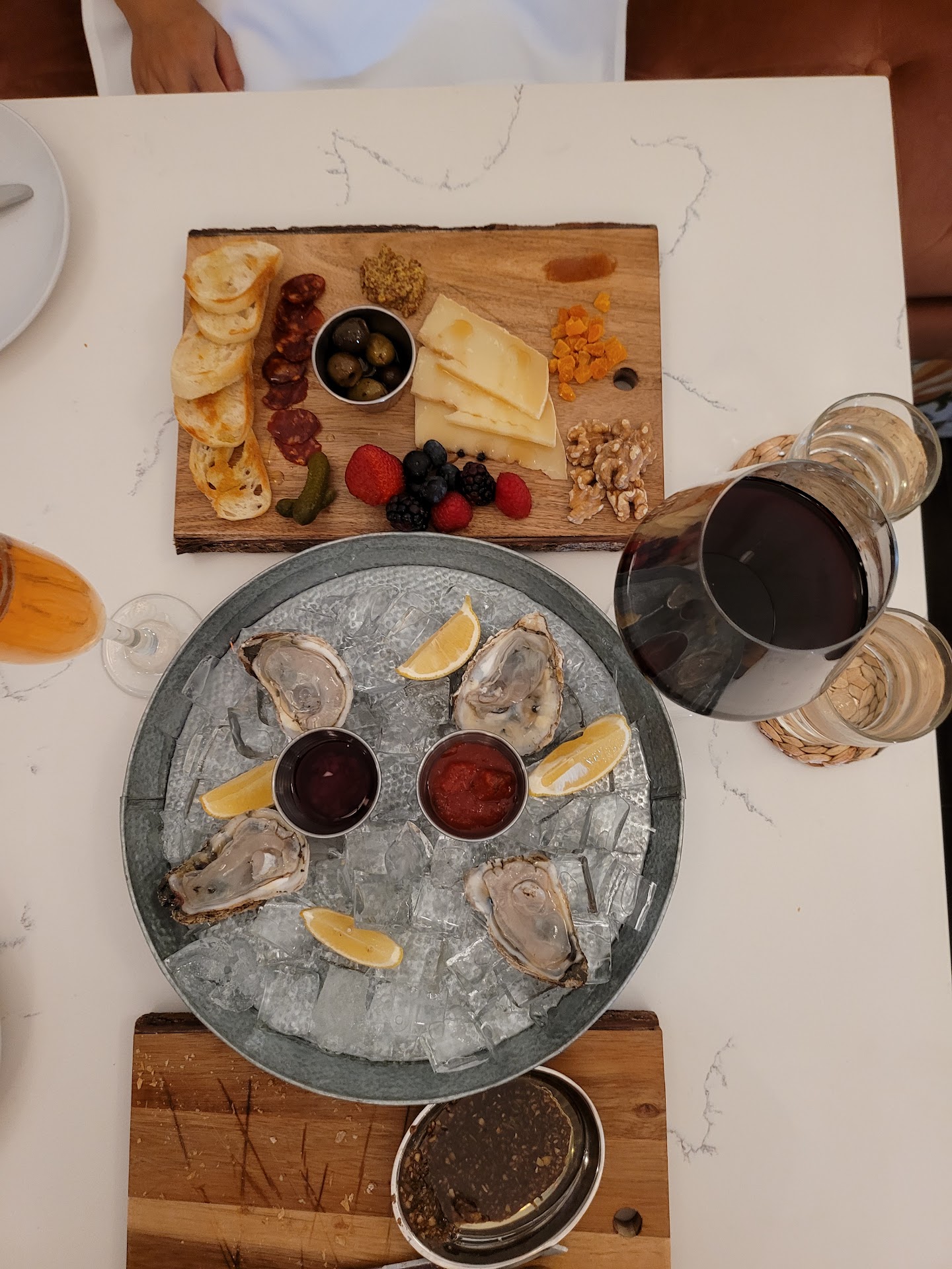 Ordered the following HH items charcuterie board, oysters(4 ct), pork belly, calamari, rosé wine, Line 39 Merlot, and prime rib dinner from the regular menu.