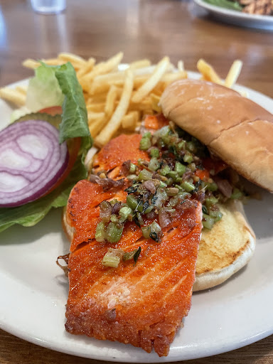 Ordered a few Alaskan beers, Salmon Filet Burger, and Halibut Fish & Chips. Food was brought out to my table within 10-15 minutes and looked amazing. The Salmon was a nice cut of meat that was grilled to perfection. The Halibut had a nice crispy batter that added crunch, but didn't take away from the taste of the Halibut. The patio tables gave a nice view of the surrounding mountains and water. Perfect place to grab a bite and enjoy the sights and sounds...
