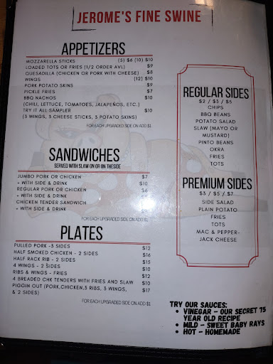 One of the BEST PULLED PORK BBQ SANDWICHES ON THE HIGHWAY. The pork is TENDER and The HONEST SMOKE FLAVOR is amazing! This pork sandwich is not like some. It was late and I just happened upon this BBQ place and after speaking with the owner Jerome who has a friendly and humorous personality. We spoke about the menu and I decided on the Large BBQ pulled pork sandwich and Baked Beans (they had a lot of pork in them๐), and cole slaw. Sauces are on the side but this pork had such a good flavor and moist, just a little sauce for accent instead of a lot was used. I will be back if I have the chance. I recommend Jerome's BBQ for friendly service and Really Good SMOKED BBQ!๐๐๐๐๐ Jerome, next time you jump on a hog out of the tree, don't bite off his ear! ๐๐๐๐ Hey, I did say you had a sense of humor๐๐...