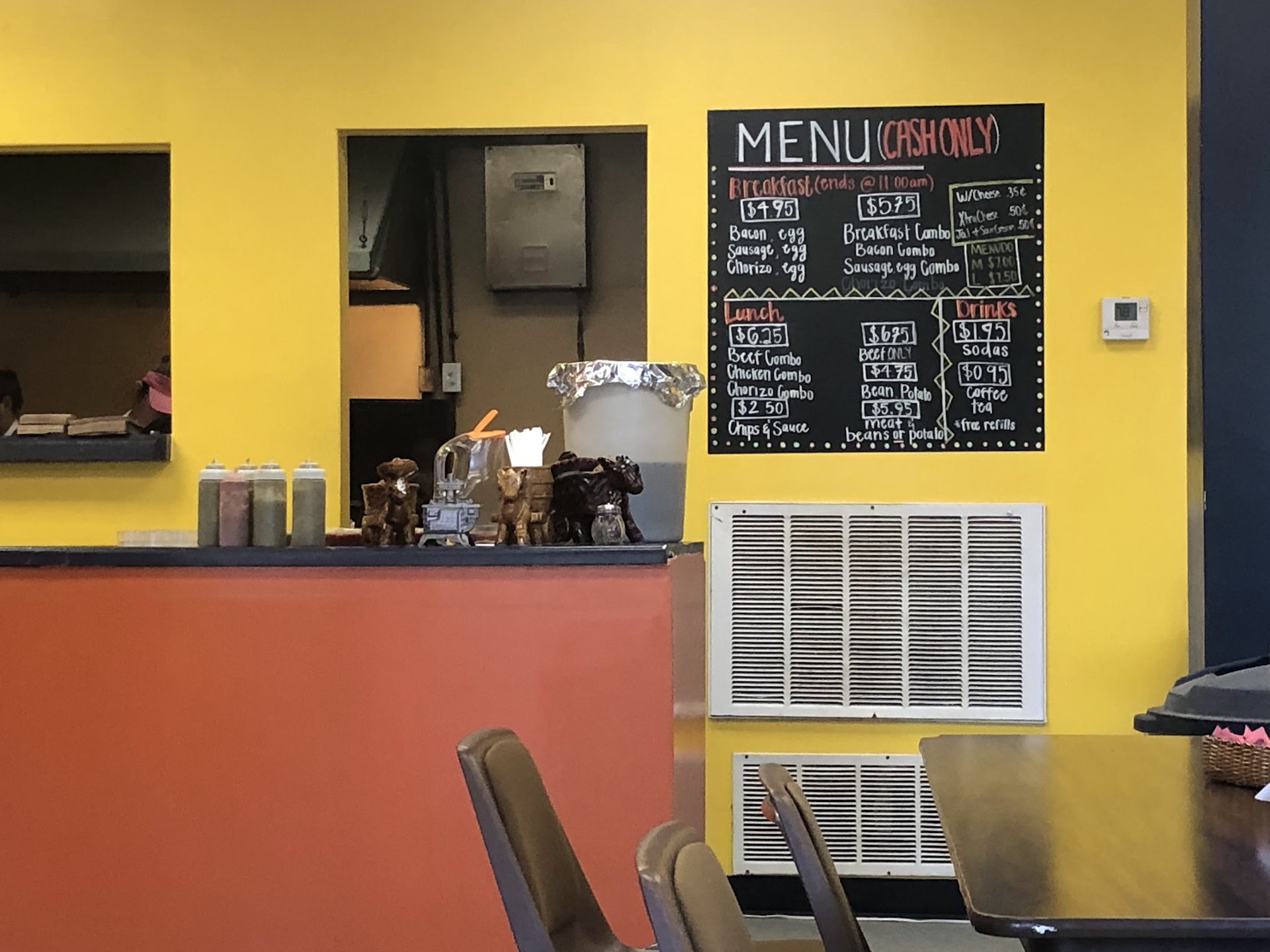Read moreClean, maybe a little dark, but good food considering the prices. I admit I was skeptical given the prices ($5.00 for one burrito) but wow! Worth it! The Burrito was massive, very well seasoned, and the optional salsa's on the side (mild & hot) were very tasty, not just bland heat. It didn't take long and was very good. The younger staff were VERY polite, the older staff as well, even if it does seem they don't really under stand me 😊 (I only speak English, Japanese, and French, and VERY little Spanish) but the food alone makes me want to learn Spanish just so I can fully convey how impressed I am! (Perhaps get a debit...