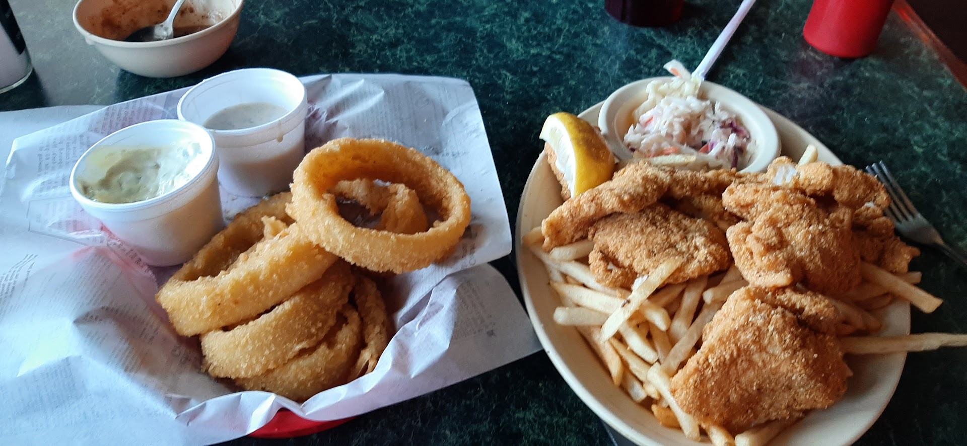 Read moreThis was my first time there along with my wife and her grandparents and our daughter. I love catfish but I also love fish and chips. So I ordered the fish and chips. I thought I could sample a few bites from my wife's plate. The fish and chips were excellent. Malt vinegar was available. The batter was a beer batter perfectly sealing the filet within which was tender and flaky. I thought I could hear Big Ben chiming in the background. The chips were delicious but had they been fried like Belgian fries, truly Fish and Chips. The portions were generous and filling. The Catfish was awesome. Get the full order and take a generous portion home for later. Battered in a lite corn mill crust and fries to a golden brown and tender fish inside and topped with the freshly made tarter sauce will make you tongue so happy it'll smack your brains out. Do order the coleslaw and you'll want a side of the pinto beans. Both delicious. My only disappointment were the hush puppies. They were sad little puppies. Over cooked and didn't rise when cooked. I can only think this was not their normal fare. Maybe the baking powder was old?. Still I give the food 5 star. I'll definitely go again and get the full order. Spent about 19 per person. Tip not included. We tipped our waitress $40. She was engaging, knowledgeable, entertaining and...