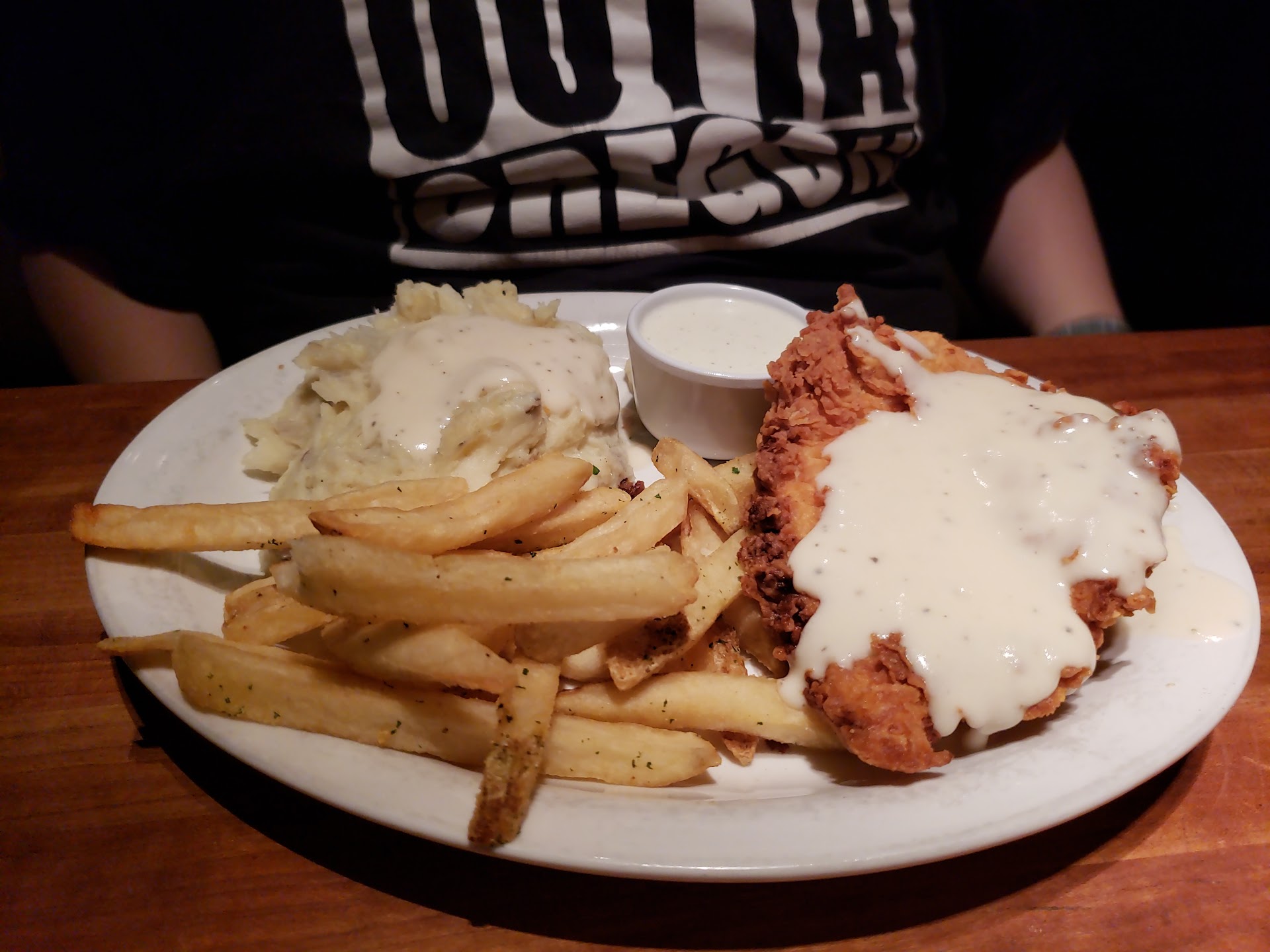 I got a Monte Cristo and fries. The sandwich was burnt in the fryer on 1 sandwich and the other sandwich was fine. And the fries were a mix of burnt and non-burnt fries. My wife had a full rack of ribs with just fries. Her fries looked really good. And the ribs too. The first half rack was nice and a bit charred, but she likes that. So it was fine. But when she was getting into the other rack. We noticed a orange sauce in the middle of the ribs in the meat and she tried it. Her mouth was on fire, so I tried it and it tasted like either hot sauce or a Buffalo sauce. Which the ribs done come that way?? So why was our mouths on fire from these ribs?? Plus that one was cooked to hell. Dry as a bone. The waiter was nice enough to make the order a half rack because of it.