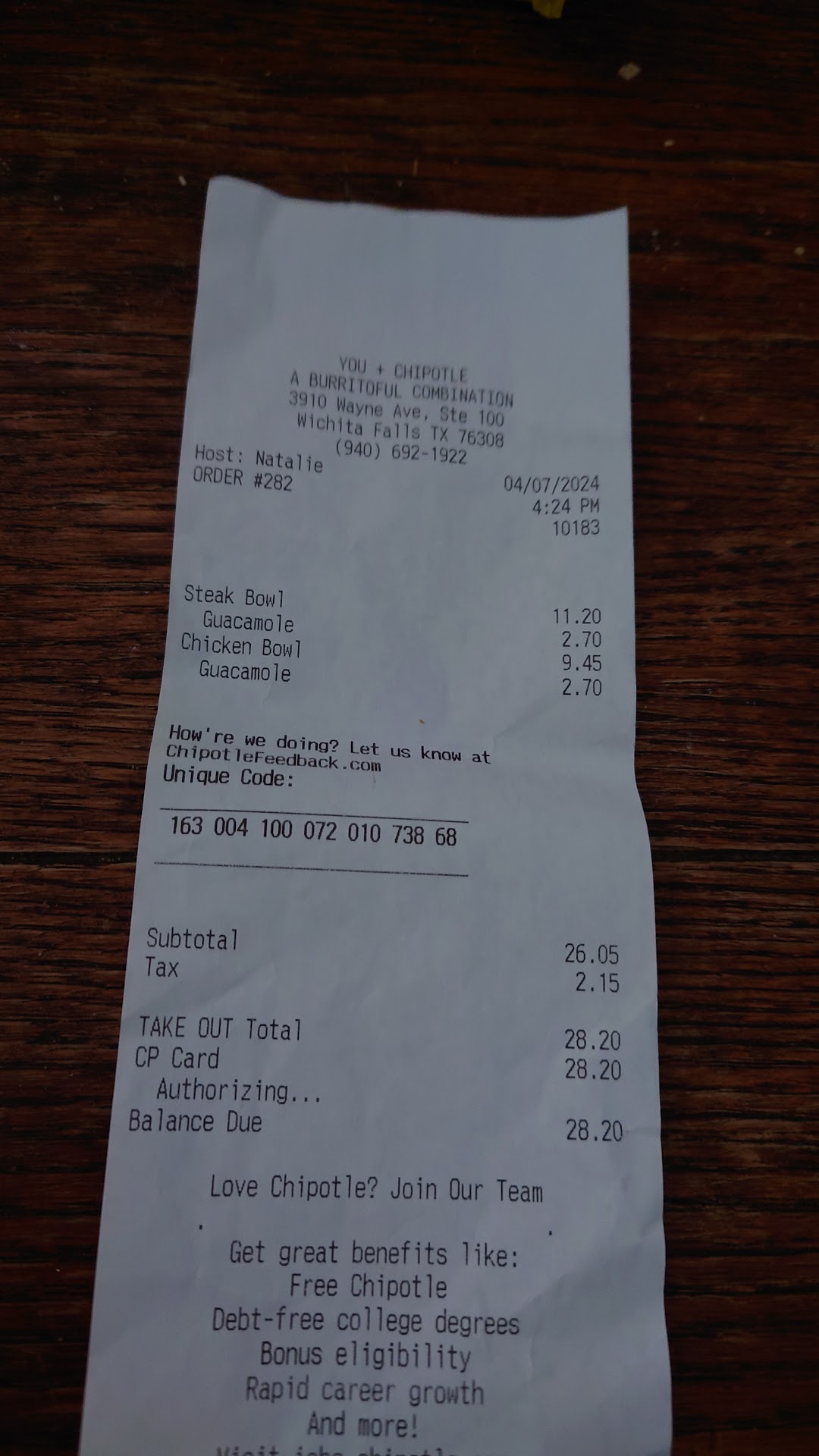 Let's do some math: 1 medium size avocado, which yields between 100 g and 150 g. These cost, as of today 4/7/24, $0.58. I weighed the avocado i got at Chipotle today, on two orders of bowls, and as you can see on the pictures, they weighed at 80g. Even if we take the lower end of the yield of the avocado at a local grocery store of 100g, that still makes the avocado at Chipotle at least 4.6 X MORE EXPENSIVE. Part of the problem is that they're inexplicably using Silicone Cake Spatulas to dispense the avocado, which obviously makes half of what they scoop up stick to the spatula. Naturally, the servers are not trained to weigh the ingredients - just scoop and toss in, so there's a semblance of the topping, but not the actual amount that you're paying for - a whooping $2.70. When i ordered my food, the young lady making it tried to scoop a little avocado and she noticed that the spatula picked up almost nothing, and just pretended like nothing was wrong, until i made eye contact and told her if she could try to give me the right amount.