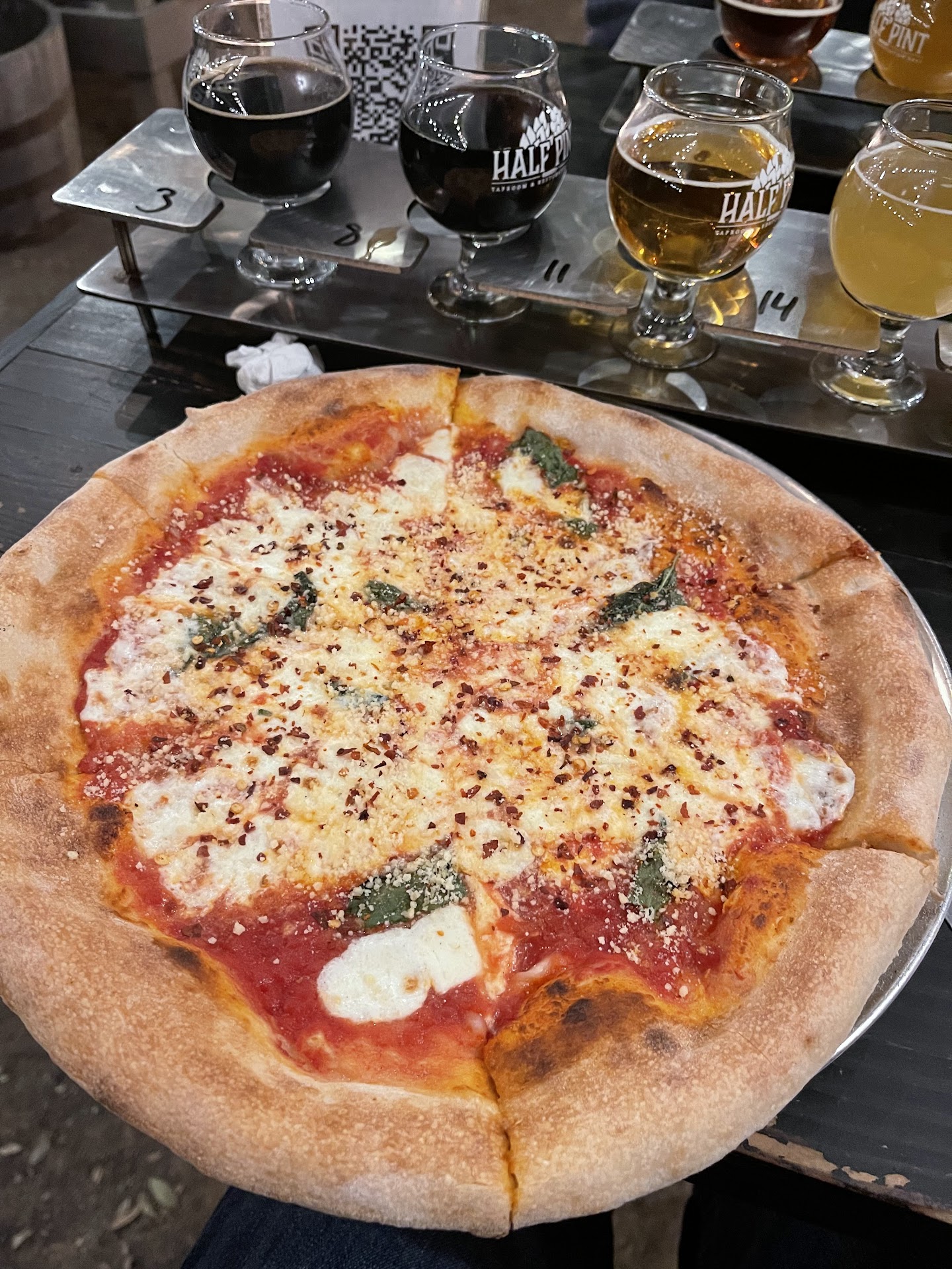 As a real estate agent, you generally have me at old building refreshed loved into full service once more- Half Pint & Restoration is no half a%*! Reloved space. From first step within and a friendly direct sign that states Seat yourself to the happy flame of a pizza oven across the room your beer & pizza loving self will be glad you stopped by. If you are fortunate to have Jennifer as your server / pizza / beer guide you will feel especially fortunate. Jennifer is passionate about matching your pizza choice w beer. Will say that with solid choices on both it is hard to miss, but Jennifer's in depth knowledge and easy share attitude makes it more fun! We visited on a Monday so seating was easy. There were scattered tables throughout the space. Service was prompt. Friendly but not hovering. The pizza crust has a nice chewy crumb- so you flat cracker bread kind of eaters will not find pizza happiness here. For most of us you may find tummy nirvana. The Pistachio Pesto (whose night dream inspired that combo?!) tastes savory and sweet simultaneously- seriously darn good. (Trying to stay PG here). I paired it w a five beer flight of my own choosing- all by numbers. Which brings me to my only ugh of the afternoon- beer is ordered and relievers by number. BUT there is no paper menus--- so you must keep a QR cheat sheet open among your party to remember what exactly 21 or 19 or 26 is... slight speed bump to perfect is still worth it. Suggested full meal fun at this lovely half pint place? May I suggest: Order the garlic cheese bread w cheese while you figure out beer flights. Taste beers while enjoying bread. Order a pizza and a sub and a pint of your flight fave. (This is best w two or more at table to share- 1 pizza is half again as big as a personal pizza from that other place). And if you have saved room one of the famed dessert pizzas for the finish along w a mouth filling stout. Slam dunk afternoon? Make your way over to Restoration for an evening of yet more fun! Best half pint hack- ask...