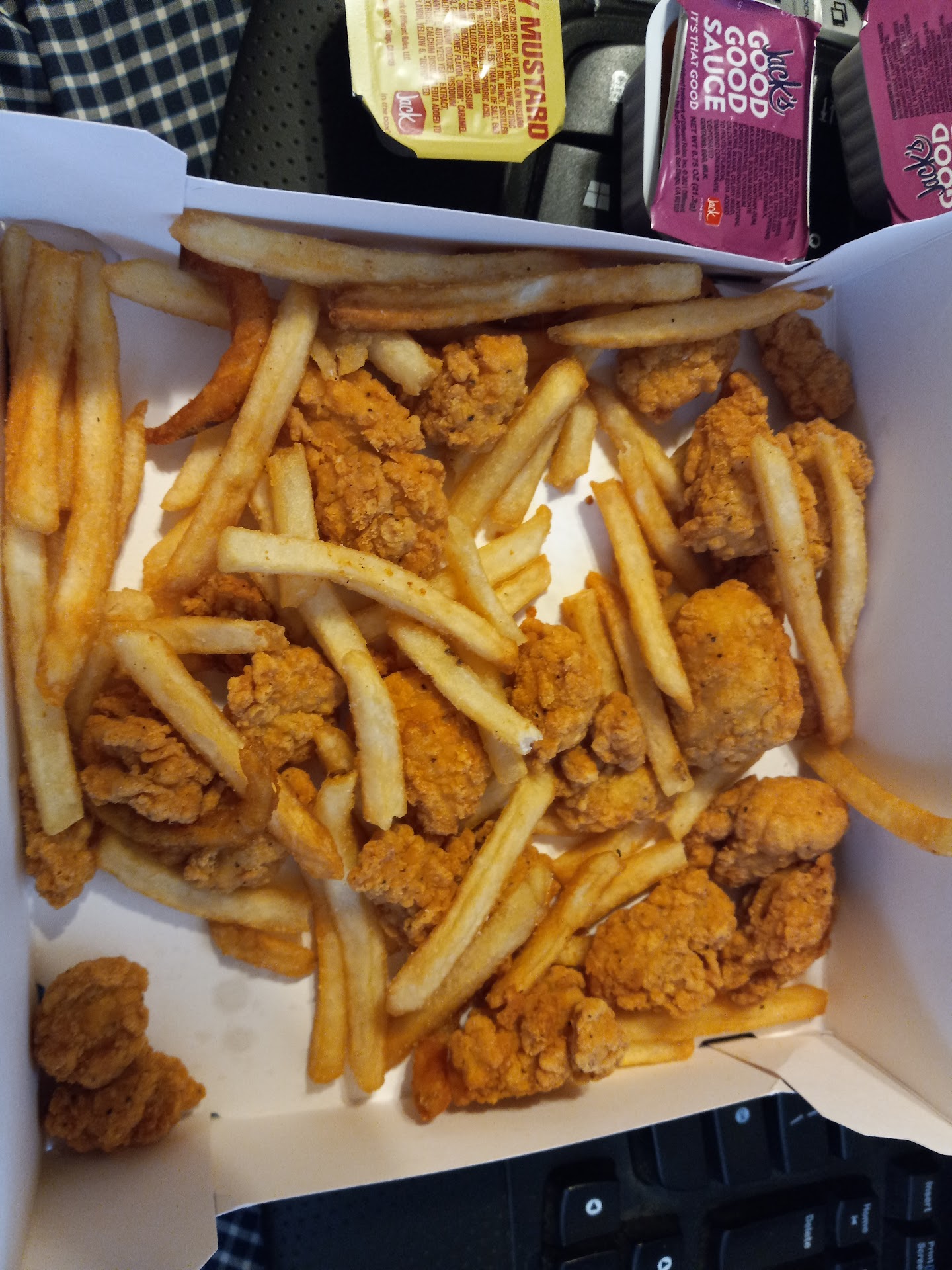 So, now this different female employee promptly rattleed off my order, as if I didn't know what I had just ordered, looking up at her screen, with no mention of the chocolate shake. I'm assuming the original female employee had forgotten to add it to our total order... in her rushed spirit.