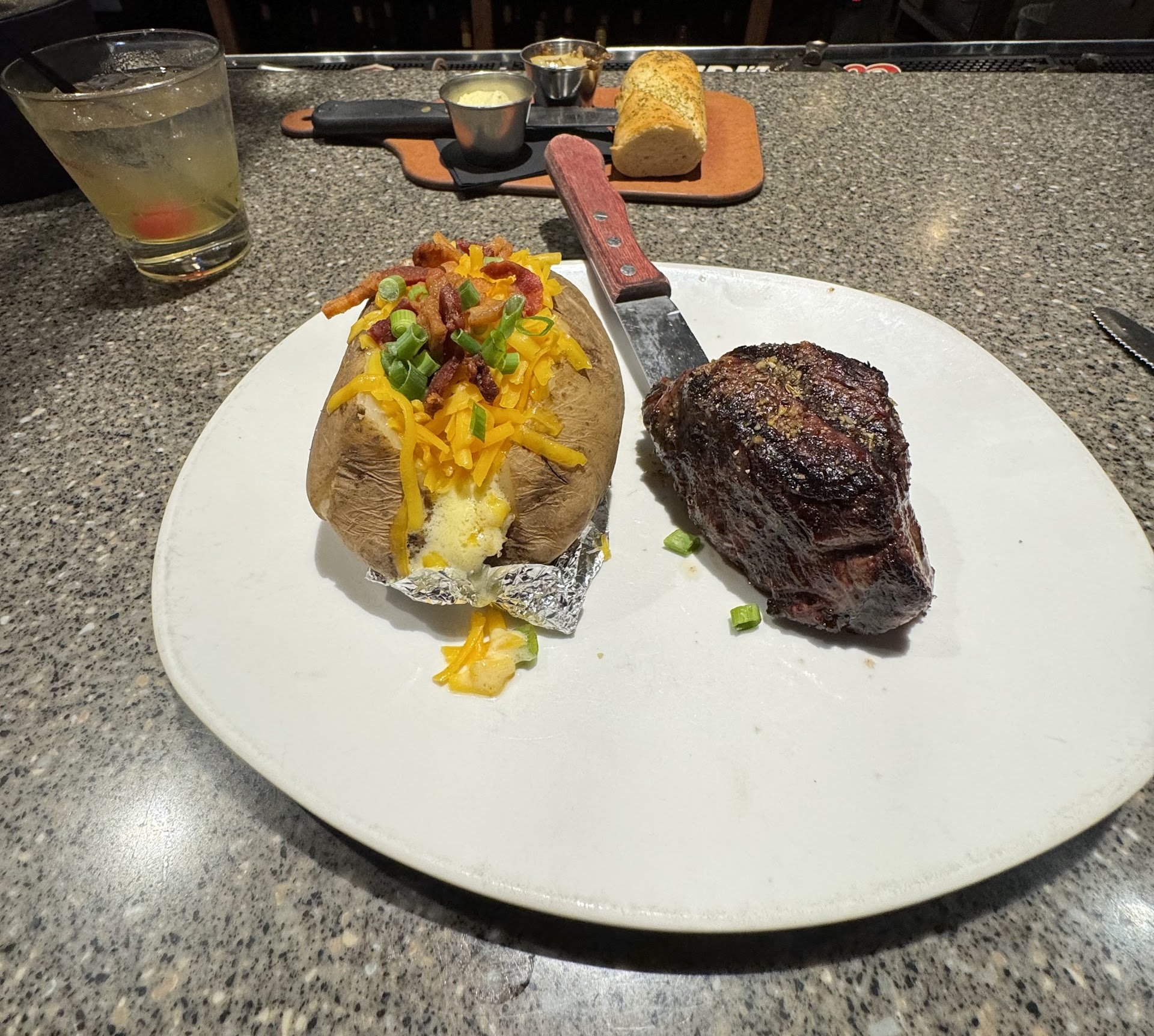 My friend and I were in town and randomly decided to try out this restaurant, and we were very happy with that decision. The ribeye was cooked to a perfect medium rare. I ordered the rosemary butter to add on top which was good but not really necessary. The steak was delicious on its own. The seared ahi tuna was delicious, and the brownie in our dessert was warm and fudgie and oh so good. I was a little hesitant about the baked Feta, but I actually quite liked it. My only complaint about the food were the mozzarella sticks. I'm not sure if they were meant to be served like this or not, but I'm not particularly fond of mozzarella stick and are completely solid where it's feels like you're just biting into hard cheese rolled in breadcrumbs. Outside of that the food we got was delicious. Oh! I didn't get a picture of this but the bread they serve with the garlic confit was yum yum good as well. We also got 2 martinis. I personally wasn't a fan of them, but that's not fault to the drinks. I think I just realized that I might not be a martini girly. đ¸ As far as the atmosphere, it's a casual dining atmosphere with dim lighting and mellow vibe, or atleast my experience was. I don't remember what our waitress' name was but she mention that they were short staffed. I honestly couldn't tell because she did a great job tending to our needs and making sure to check in with us regularly. Overall this was a great experience and I will definitely be stopping by here again the next time...